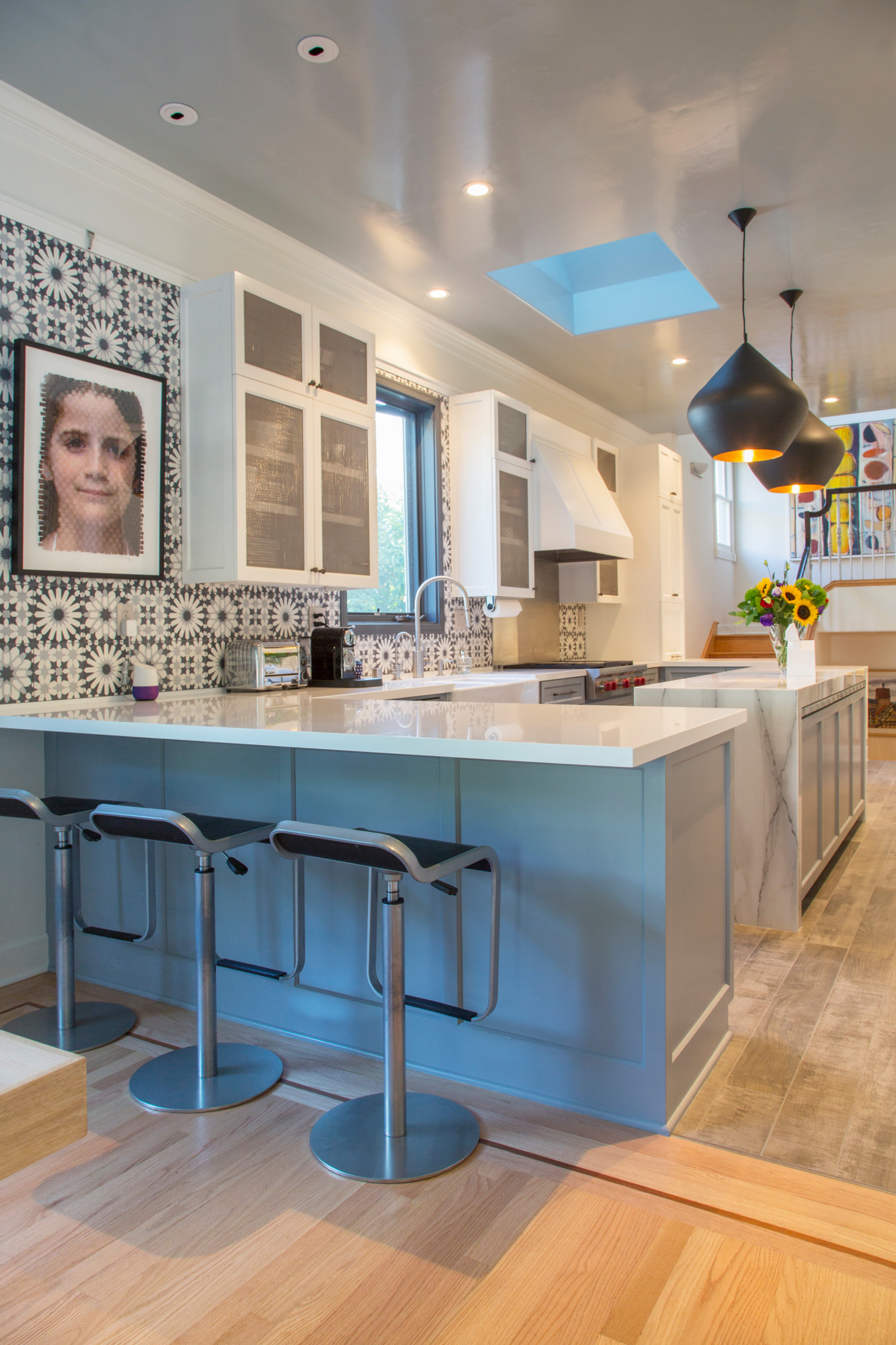 For the island, the couple chose a thick Calacatta Lincoln marble countertop. They also added a skylight to introduce more natural light. For the upper-cabinet fronts, they went with mesh wire. “I had seen something similar on Houzz. They actually are a bit sparkly, or light-reflective, and I like them even much more than I anticipated,” Martha says.