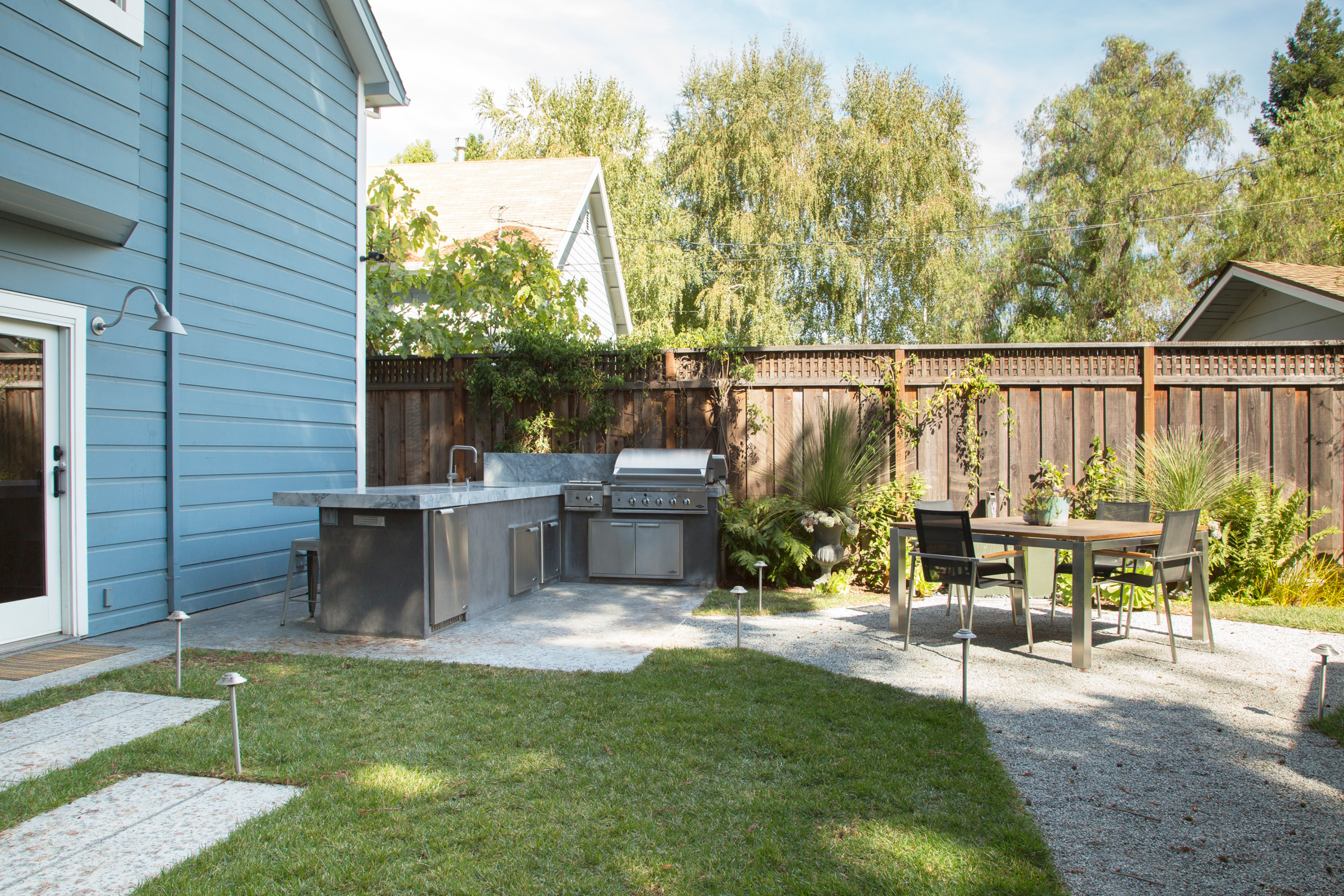 The couple redesigned their front and back landscape in 2011, before their kitchen overhaul, working with Jarrod Baumann of Zeterre Landscape Architecture. “The reason we did the outside first is because the house is small, and when we hosted parties it was really tight. We wanted to use the outdoors for entertaining and to barbecue. The backyard can seat up to 20 people, and we also held our daughter’s high school graduation party with up to 80 people.”