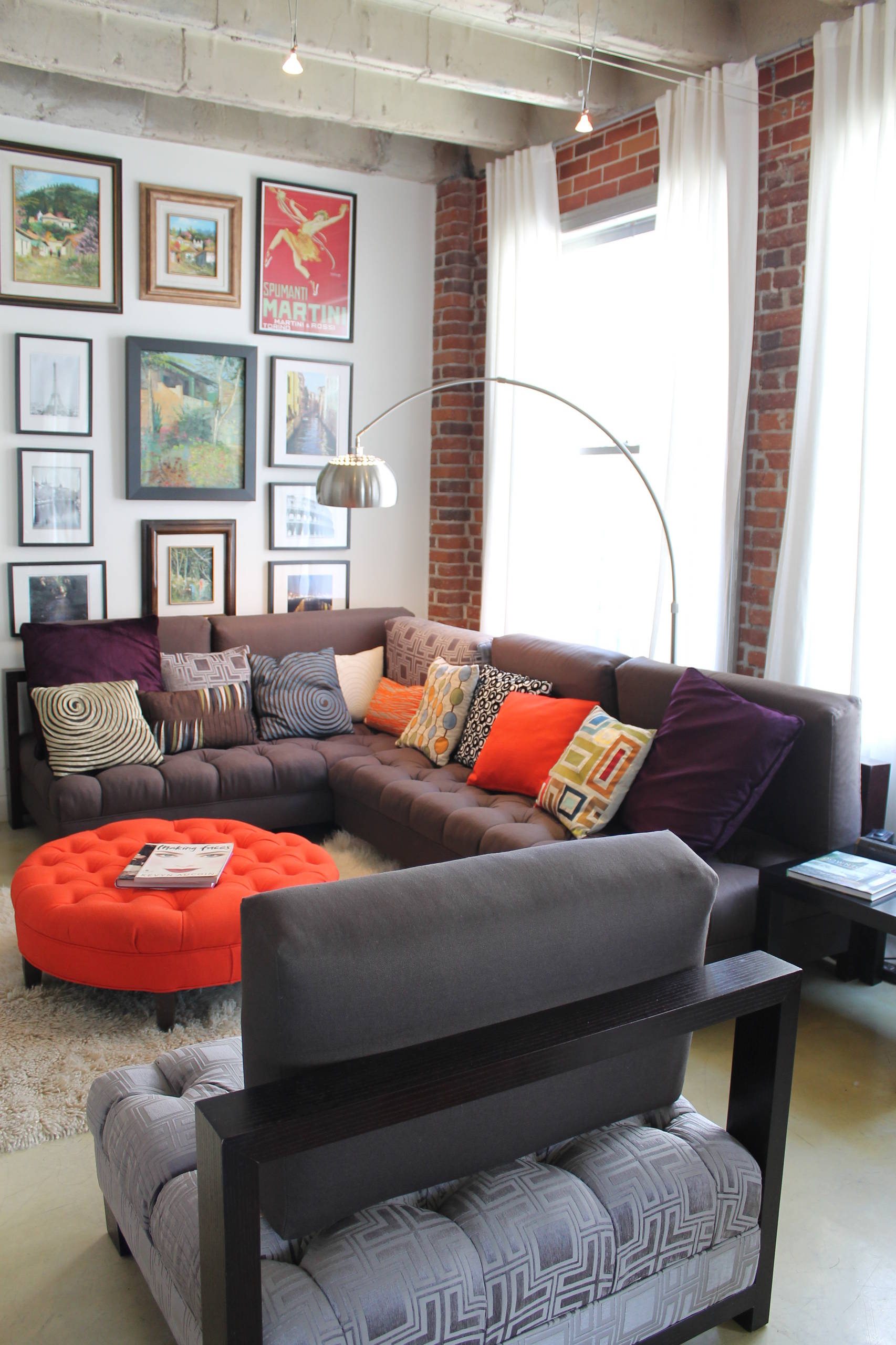 Genie reupholstered and tufted her big-box store sectional to create a custom look. She also refreshed the formerly fringed Ethan Allen ottoman with a hot red-orange linen. Brightly patterned throw pillows add more visual flavor.