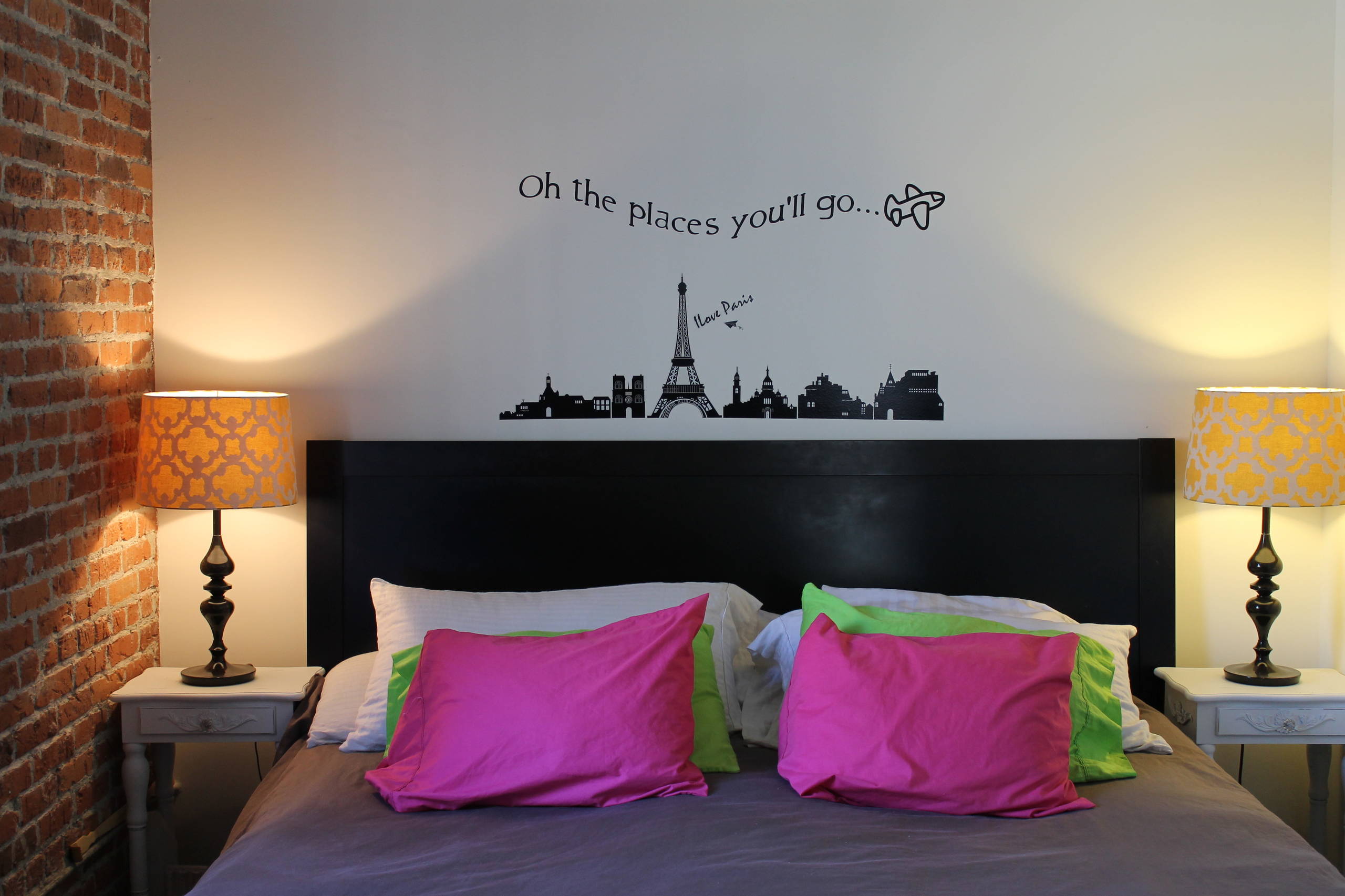 Craigslist lamps with shades from Target flank the bed atop vintage nightstands. Genie found this wall decal on Amazon.
