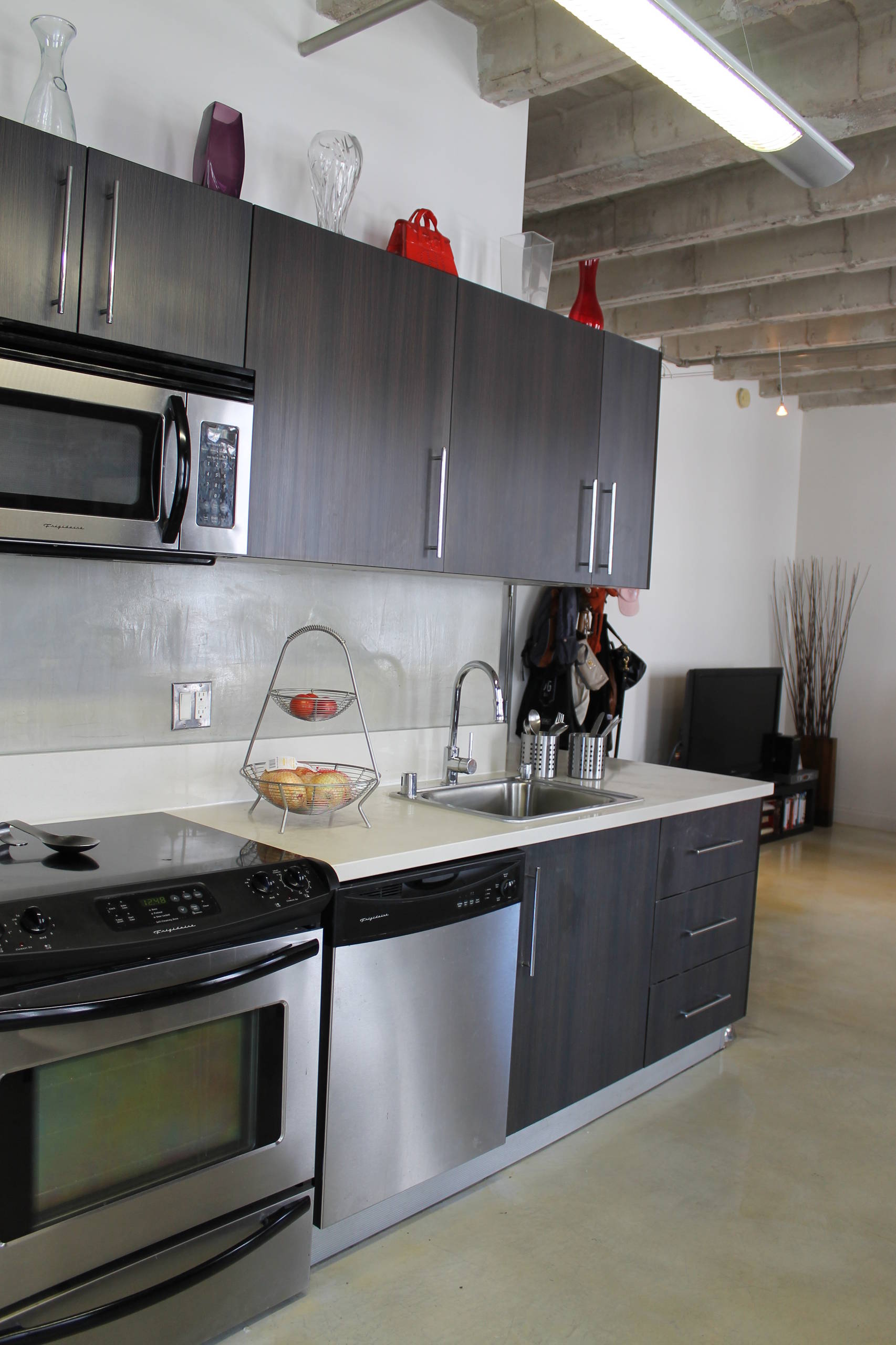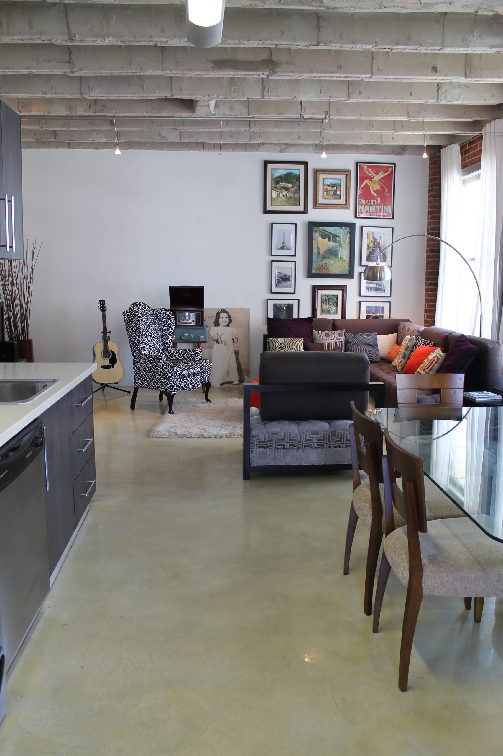 The loft's open kitchen and dining spaces easily accommodate intimate dinners and impromptu parties.