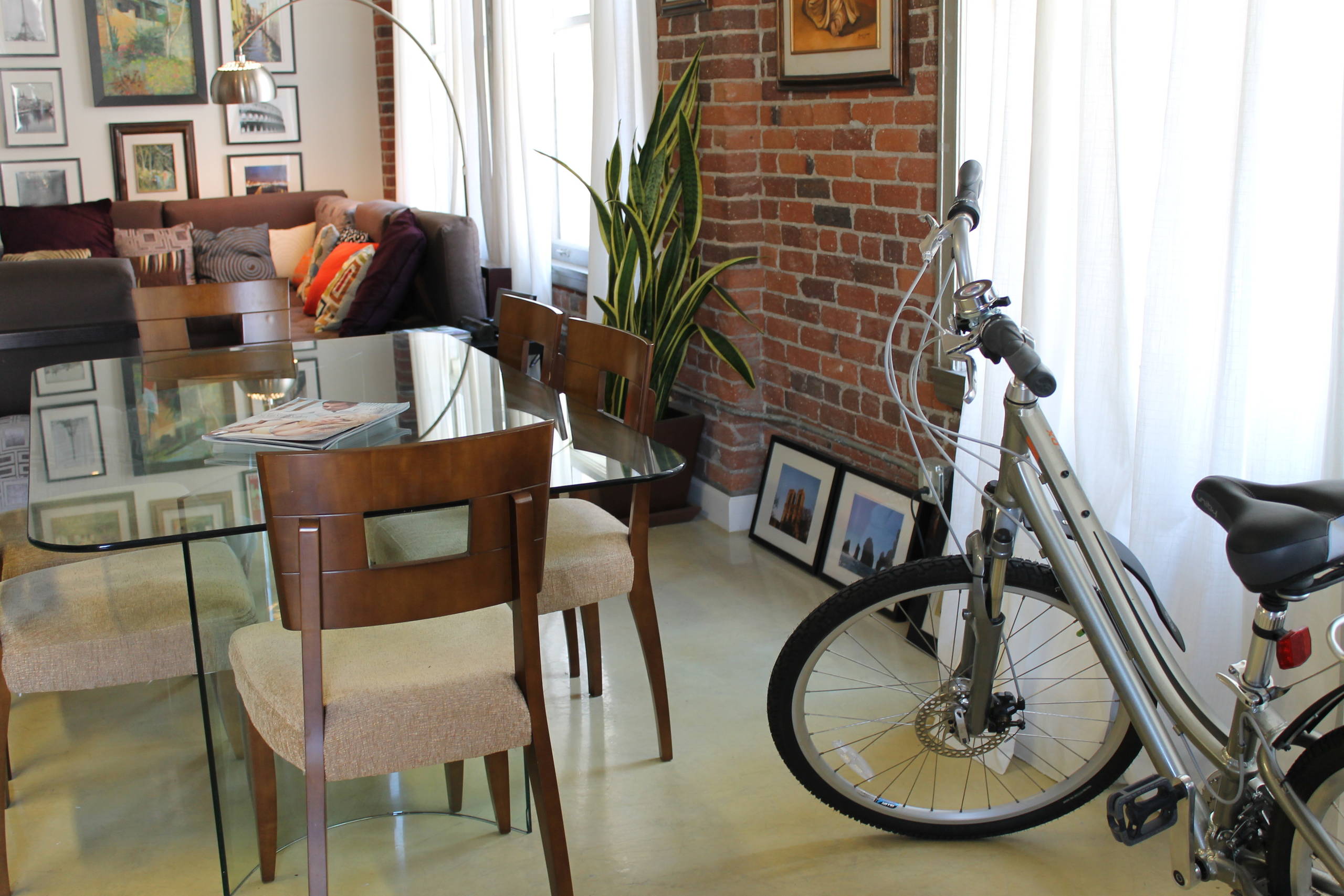 Genie paired a contemporary glass dining table with midcentury modern chairs she found on Craigslist. She likes to park her bike front and center for easy access, rather than hang it on a wall.
