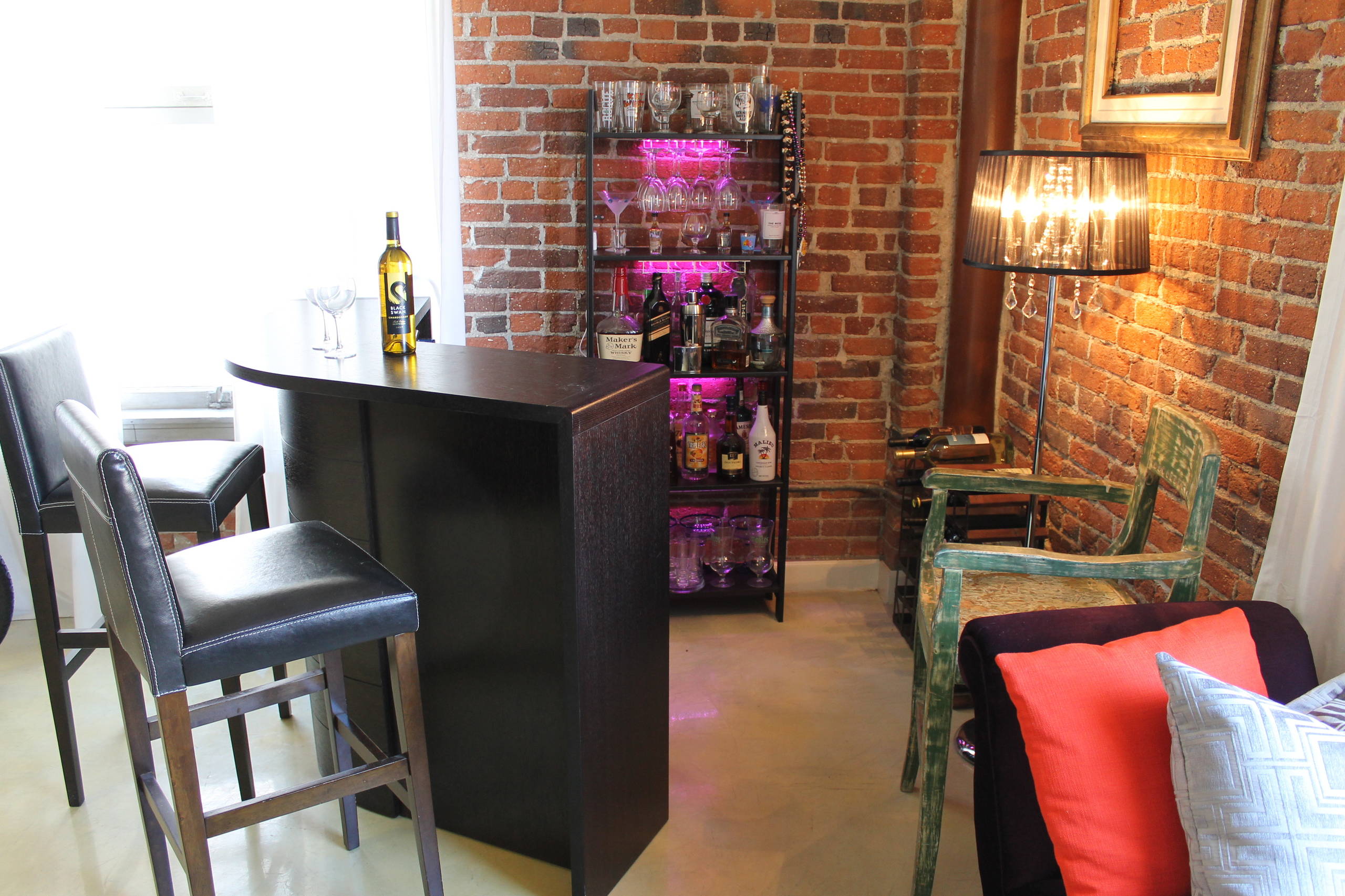 "I knew I was home once my bar was in place," Genie says. A chandelier floor lamp from Adesso provides mood lighting and adds a Parisian ambience.