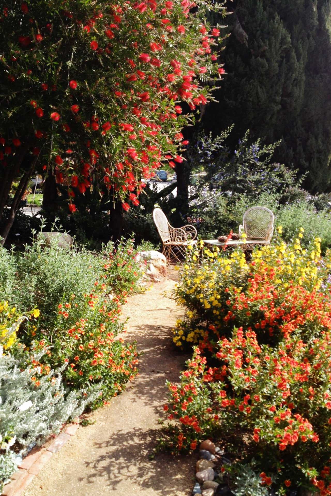 Additionally, the landscape redesign reduced water runoff through a series of terraces that slow the water down and allow it to percolate into the soil. The decomposed-granite path provides garden structure and allows visitors to move through the garden while allowing water to drain. “I don’t want it to be something that you just bypass,” the designer says.