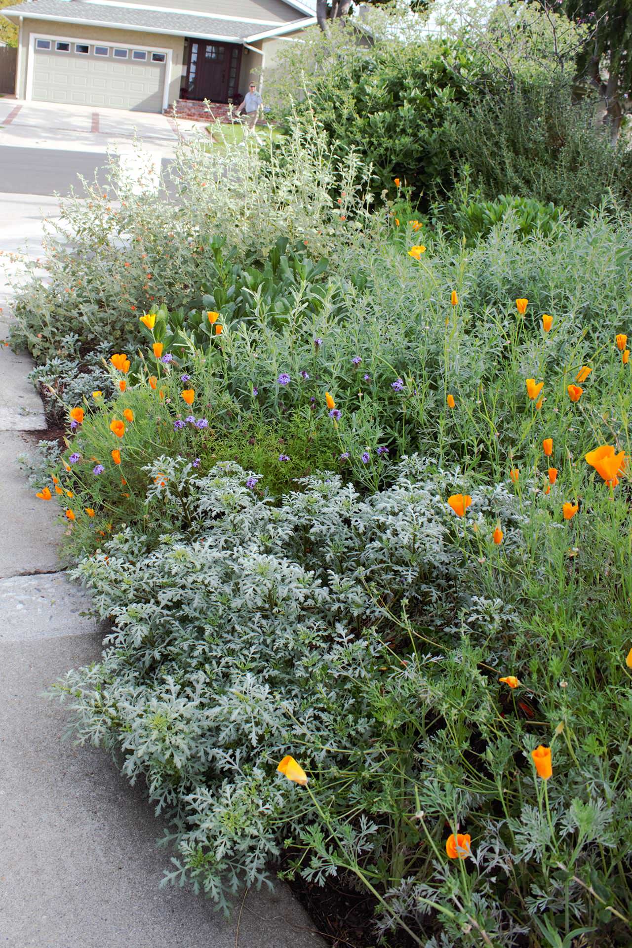 Crist discovered native plants after she had planted her Mediterranean garden. Over time she has replaced the plants that have died with native alternatives — planting California sages where there had been Mexican sage, for instance. While an olive tree still graces the front yard and Mexican evening primrose cascades from the parking strip into the street, roughly 70 percent of her plants are now native.