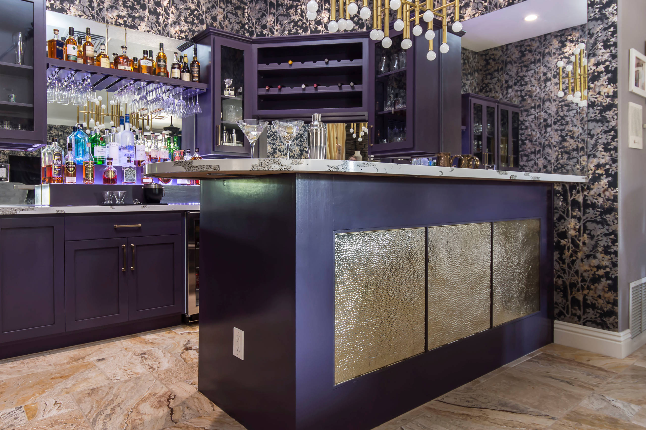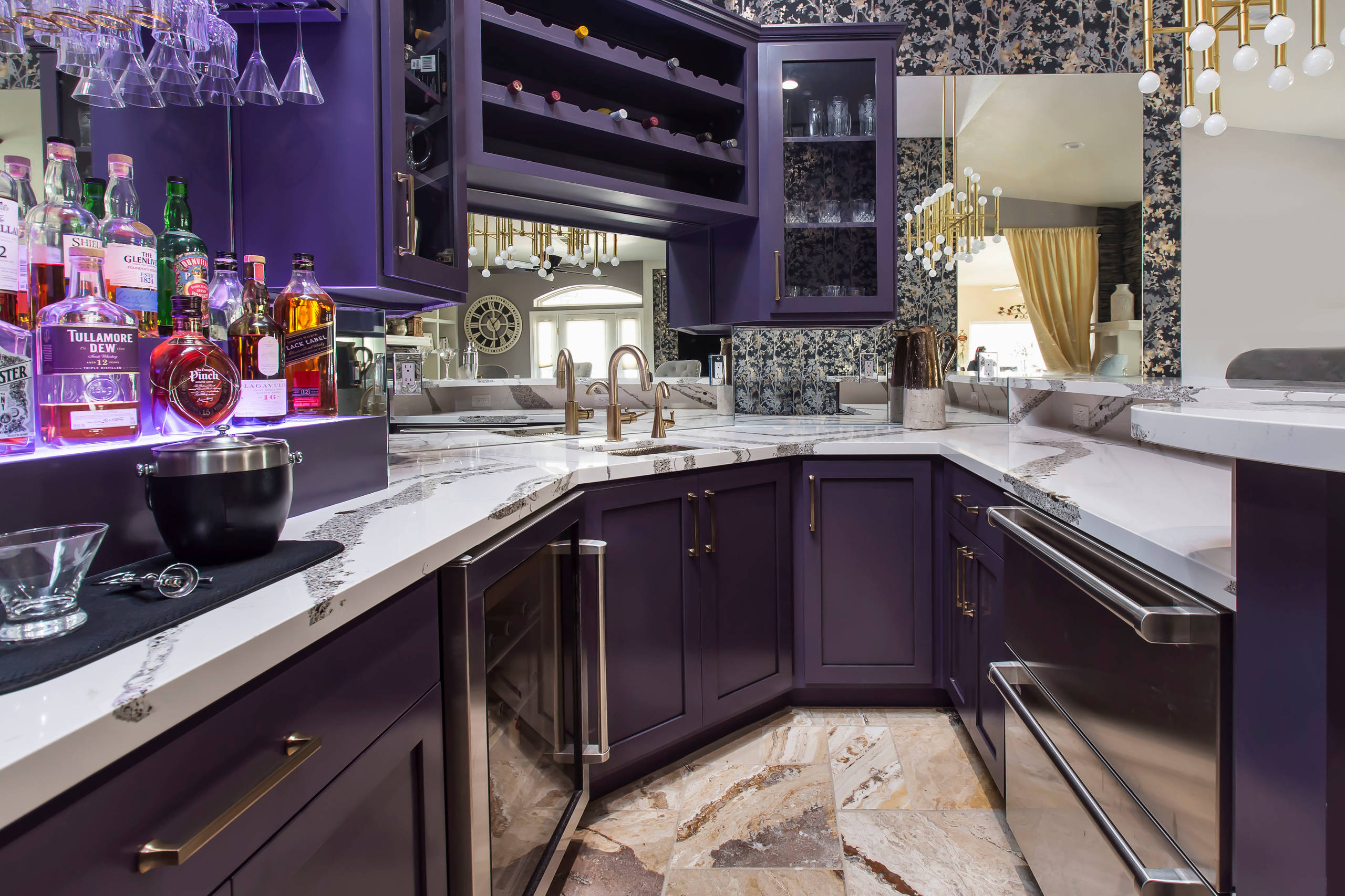 The house has become an even bigger draw since the recent renovation of the home bar. The glamorous space features new cabinets painted a bold shade of purple, plus quartz countertops with flecks of gold and purple and amenities including a wine refrigerator, sink and ice maker.