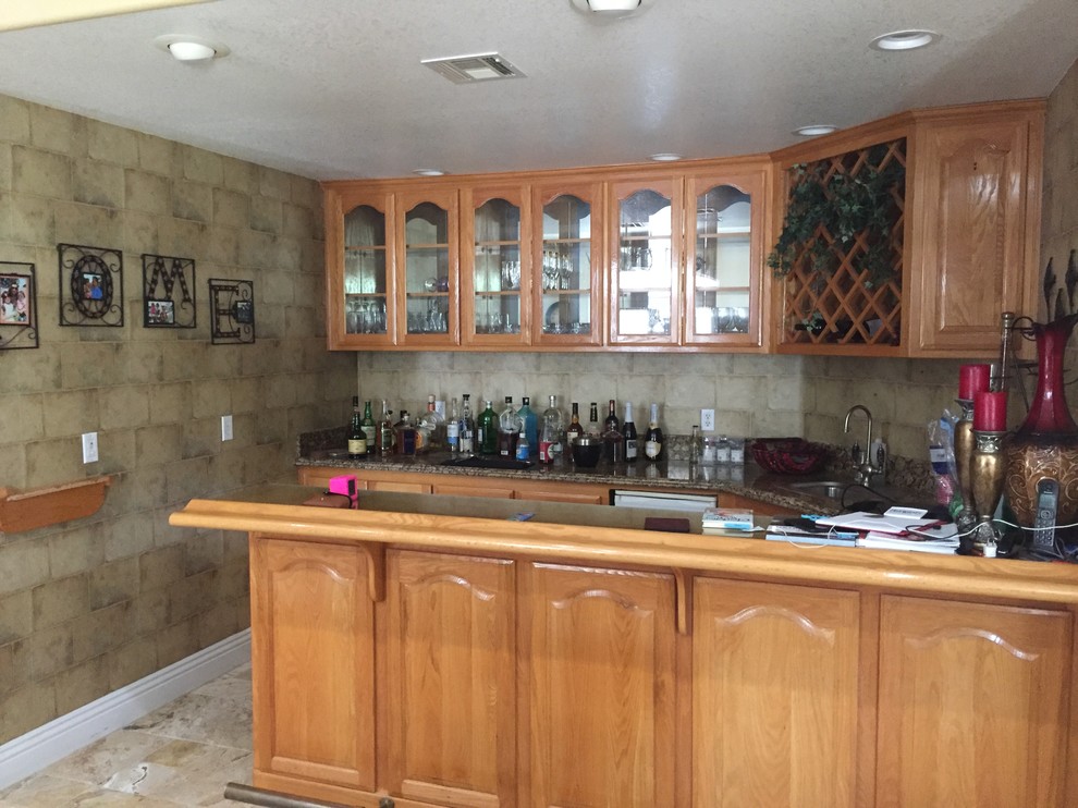 Before: The previous bar area had light-toned oak cabinets, faux-brick wallpaper and mottled brown granite countertops.