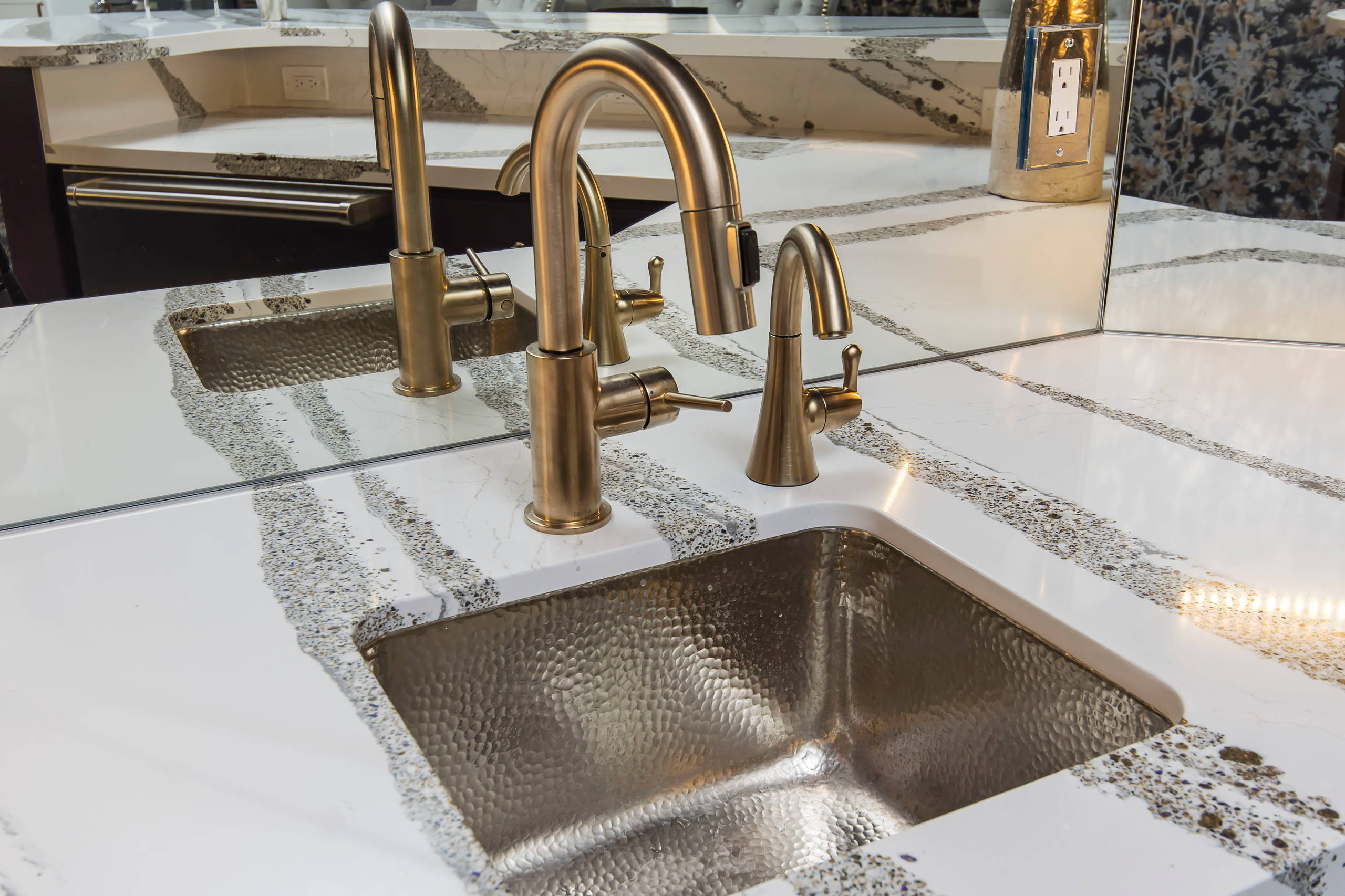 One of the early purchases for the renovation was the quartz countertop, from Cambria’s Annicca line. The marble-look quartz has specks of gold and purple that inspired the rest of the design. “They wanted to create a Las Vegas vibe for the space, so we found items with a little bling to them,” interior designer Heather Poulliot says.
