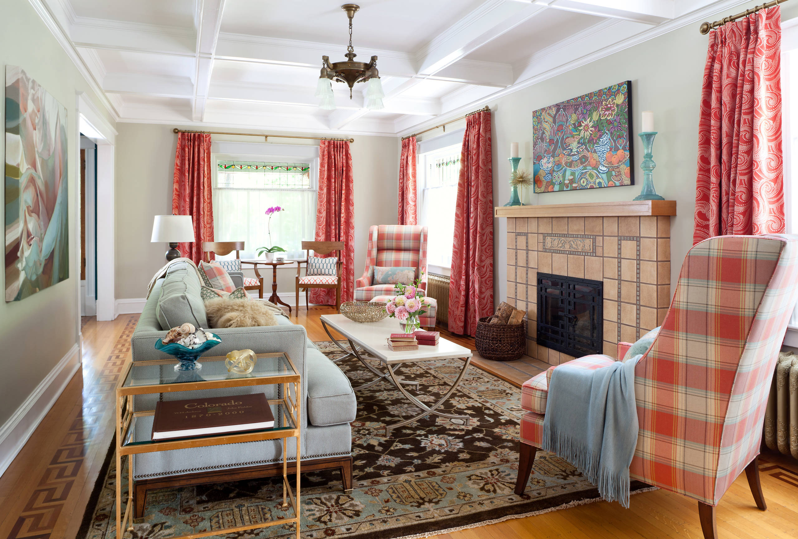 Homeowners’ request: Keep the integrity of the pattern-bordered wood floor, original ceiling light, fireplace tile and stained-glass windows while adding patterned drapery and making the long, narrow room feel cozy and functional.