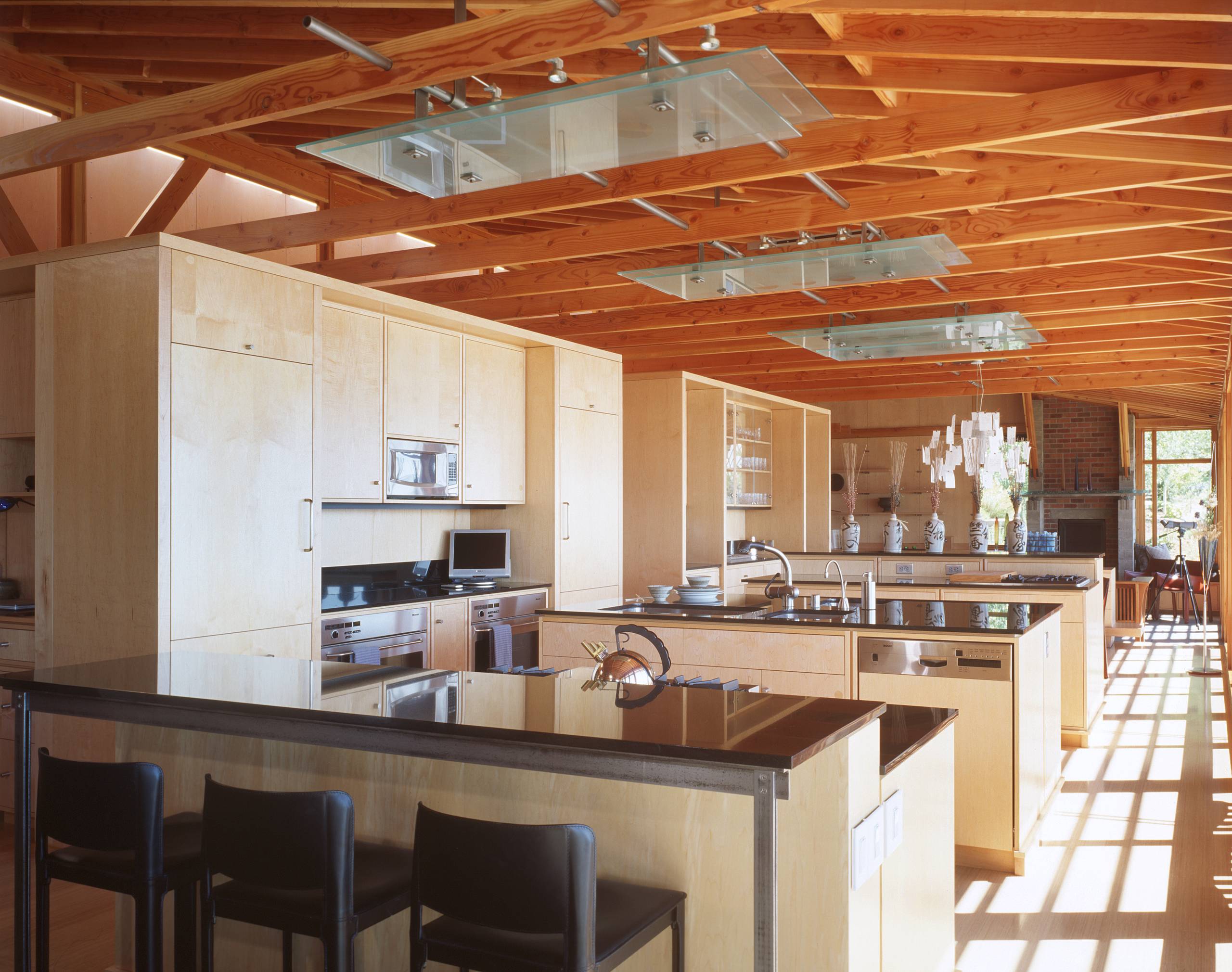Why it’s raw: “The entire home was built with the emphasis on expressing the building elements rather than covering them up with drywall,” says contractor Tad Fairbank. “Douglas fir studs, rafters and beams were sanded to remove all stamps and labels so as to only reveal the raw wood.” Cabinets are natural maple wood. Tempered glass panels on the ceiling shield commercial grade, low-voltage lighting.
