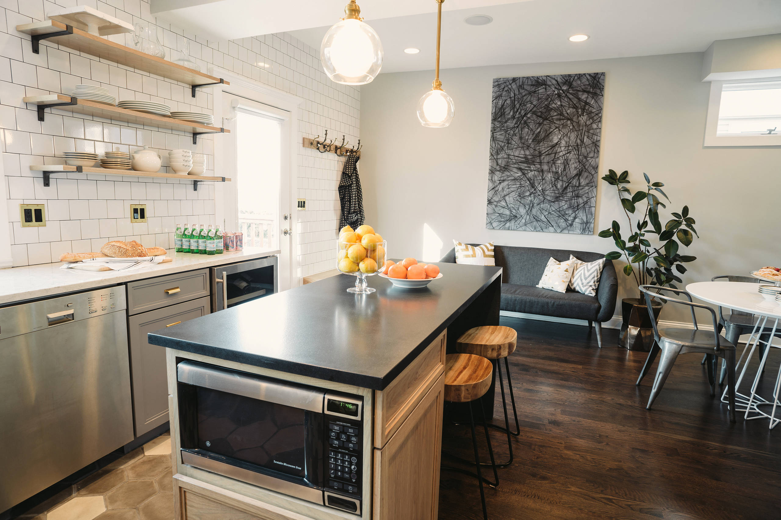 Splurges and savings: The homeowners saved by reusing their original appliances purchased a couple years earlier and splurged on a wine refrigerator and the flooring design.