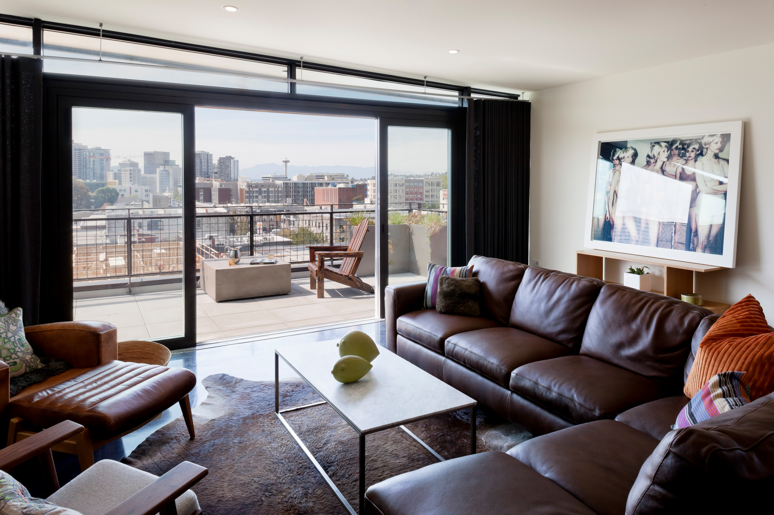 Homeowners’ request: Open the kitchen to views of Seattle seen through the living room and deck, where there’s a gas fire pit that allows year-round entertaining. “Grabbing a bit of cheese and crackers and a bottle of wine to take out on the deck is easy,” Kennedy says.