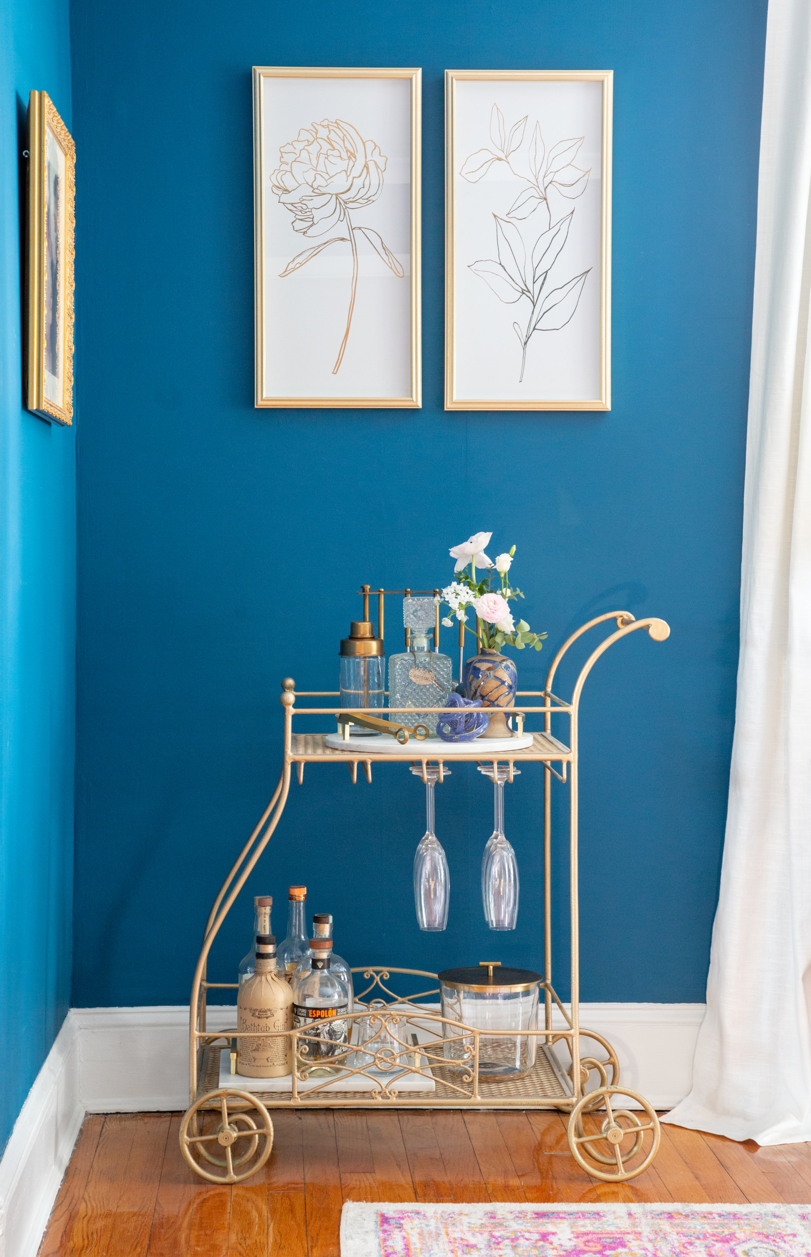 Designer tip. “I think it is extremely important to include pieces that are sentimental to a client, and to show clients how they can update these pieces in a modern way,” Chiprut says. “For example, my client inherited her mother’s vintage white tea cart, which, with a new coat of paint, was instantly transformed into a modern minibar [shown here].”