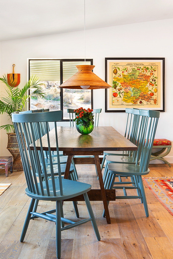 Main feature. “The custom dining table is clearly the focal point,” Chasman says. “Created by Ross Alan Reclaimed of North Hollywood, this table is made of old, dried, reclaimed oak boards, which were planed, sanded, stained and finished with a durable but unshiny polyurethane and topped with good furniture wax. All the imperfections were left in — burls, knot holes, an area of rot that was darkened — and they all add to the charm of the piece.