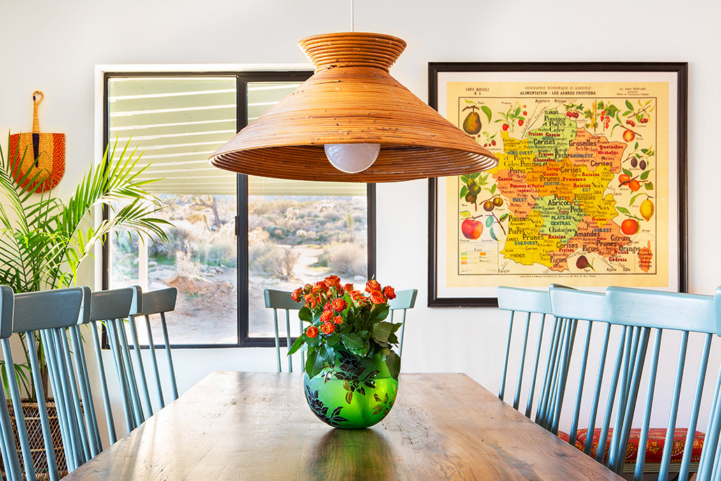 Other special features. Vintage Windsor chairs painted in Green Smoke by Farrow & Ball and then lacquered for a “smoother, powder-coat kind of finish,” Chasman says. The light fixture is a midcentury rattan and brass-trimmed pendant that Chasman fitted with a large globe bulb. A French agricultural map depicting fruits and their regions hangs on the nearby wall. A palm in a rattan plant stand adds some greenery and texture to the tableau.