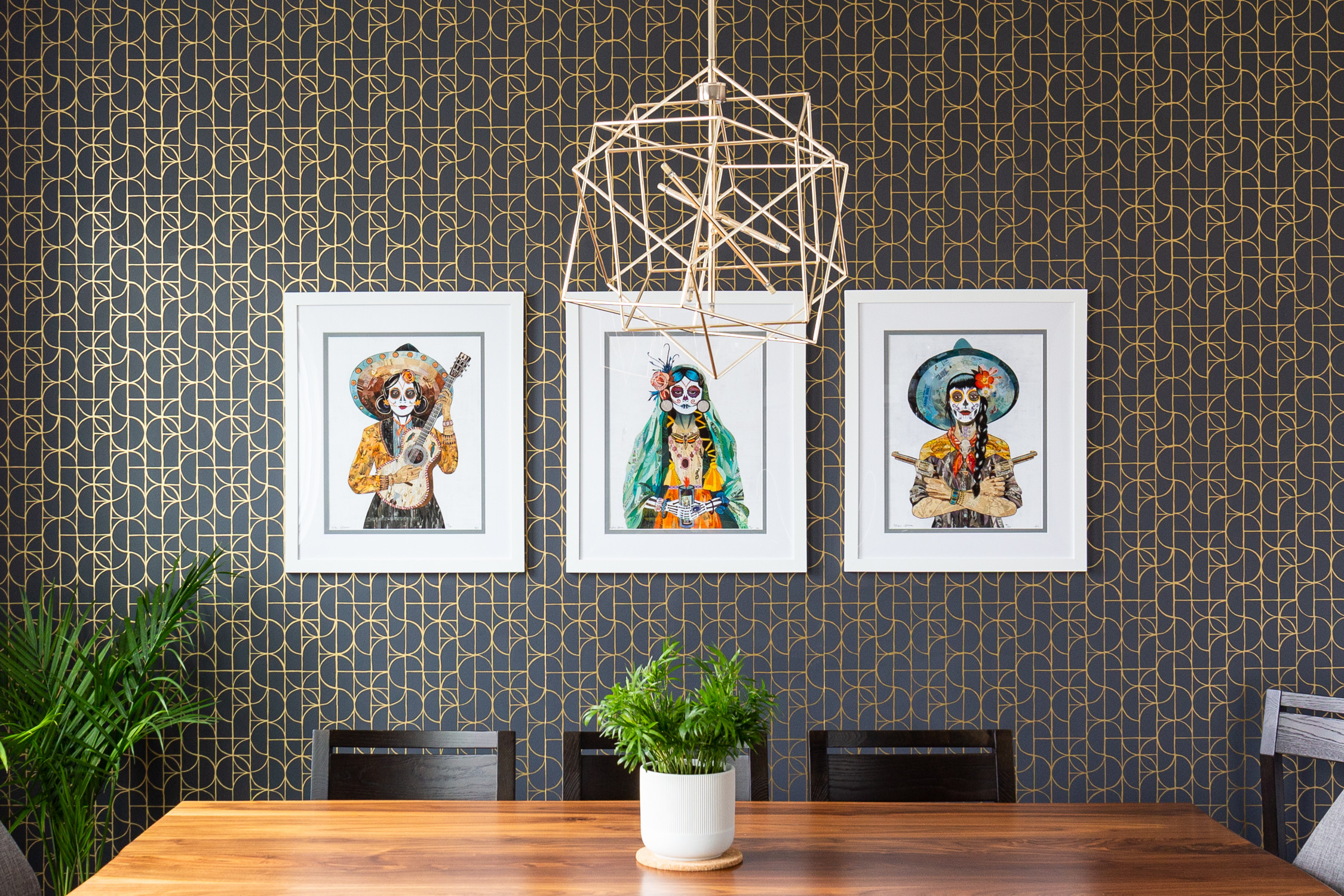 Other special features. Gold-and-charcoal geometric-print wallpaper. Custom walnut table and bench. The table has a forged blackened-steel base with a walnut cross brace. Geometric LED pendant with a high-gloss soft gold finish.