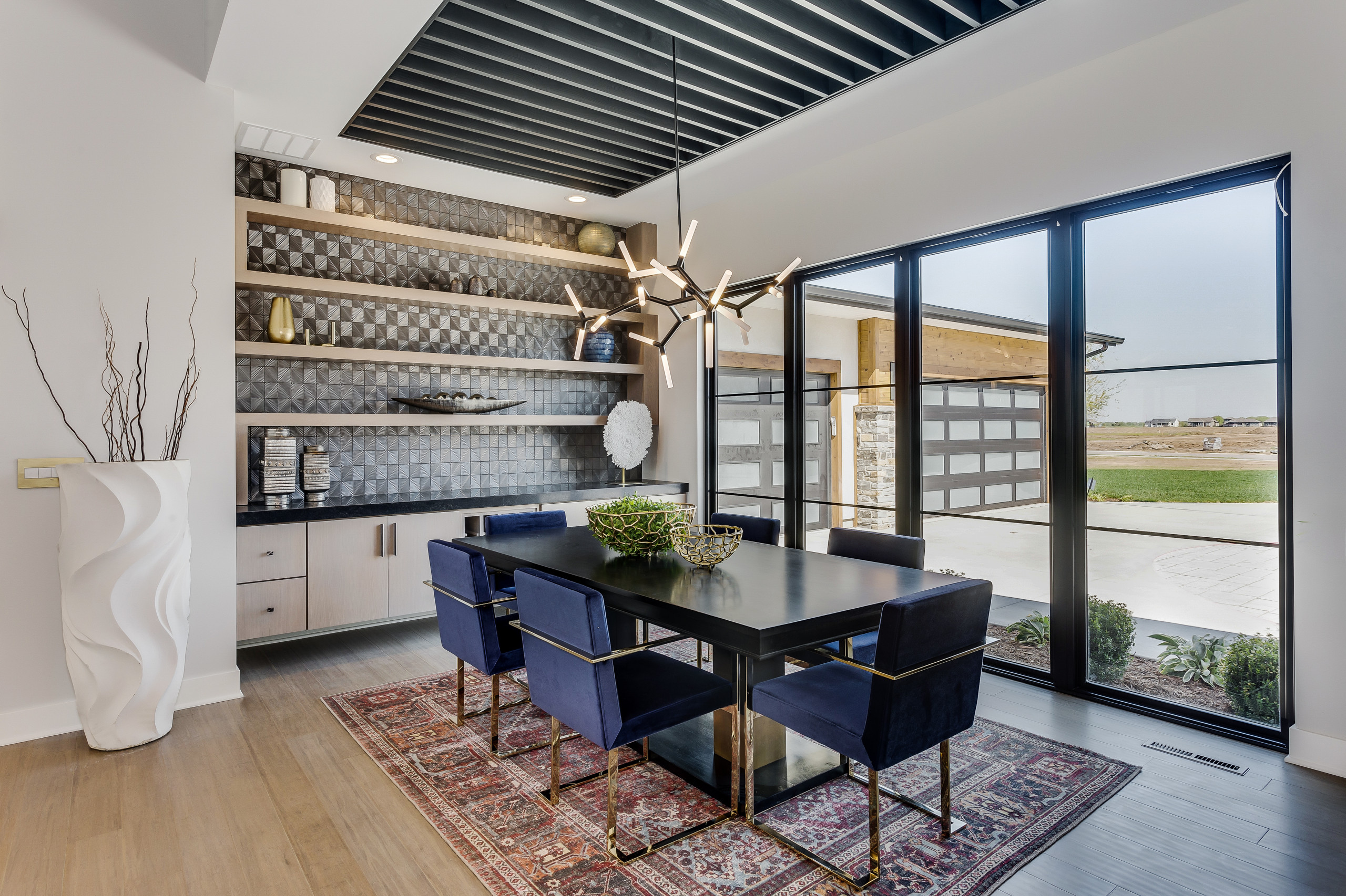Homeowners’ request. “The vision for this model home was to achieve an eclectic mix of contemporary elements with a classic undertone,” says designer Brandon Salisbury, who used Houzz to gather inspirational ideas for this project. “The dining room in particular was situated at the front of the floor plan so that the enclosed patio lanai could extend along the rear of the home, taking advantage of the outdoor living that this home’s ski lake location provides.”