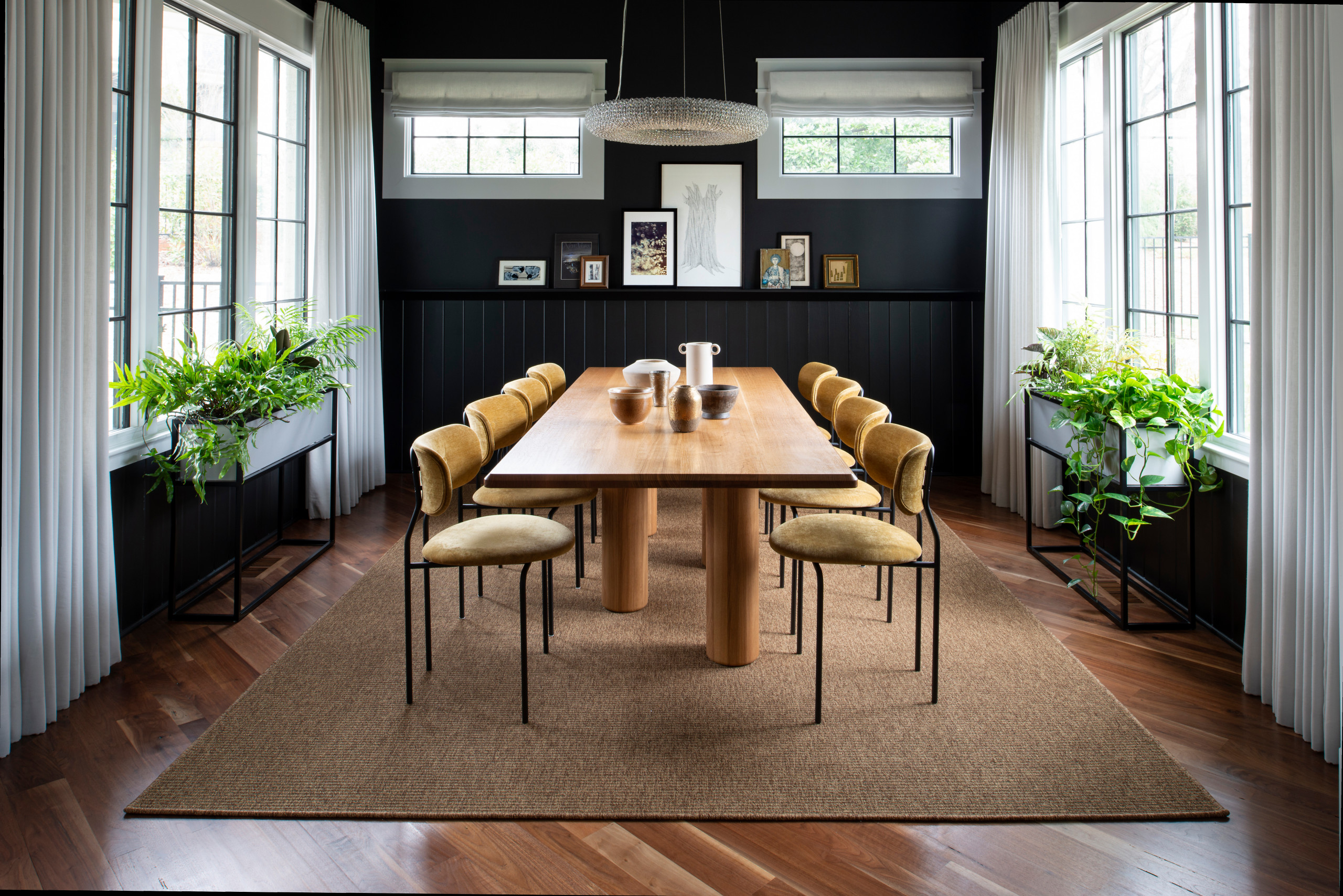 Designer tip. “This room is practically a square and full of windows,” Moore says. “So we used plants to fill some of the space around the table and put all that natural light to good use. We love using plants in interiors because they are known to reduce stress, improve mood and help with air quality. And we like using lots of natural elements.”