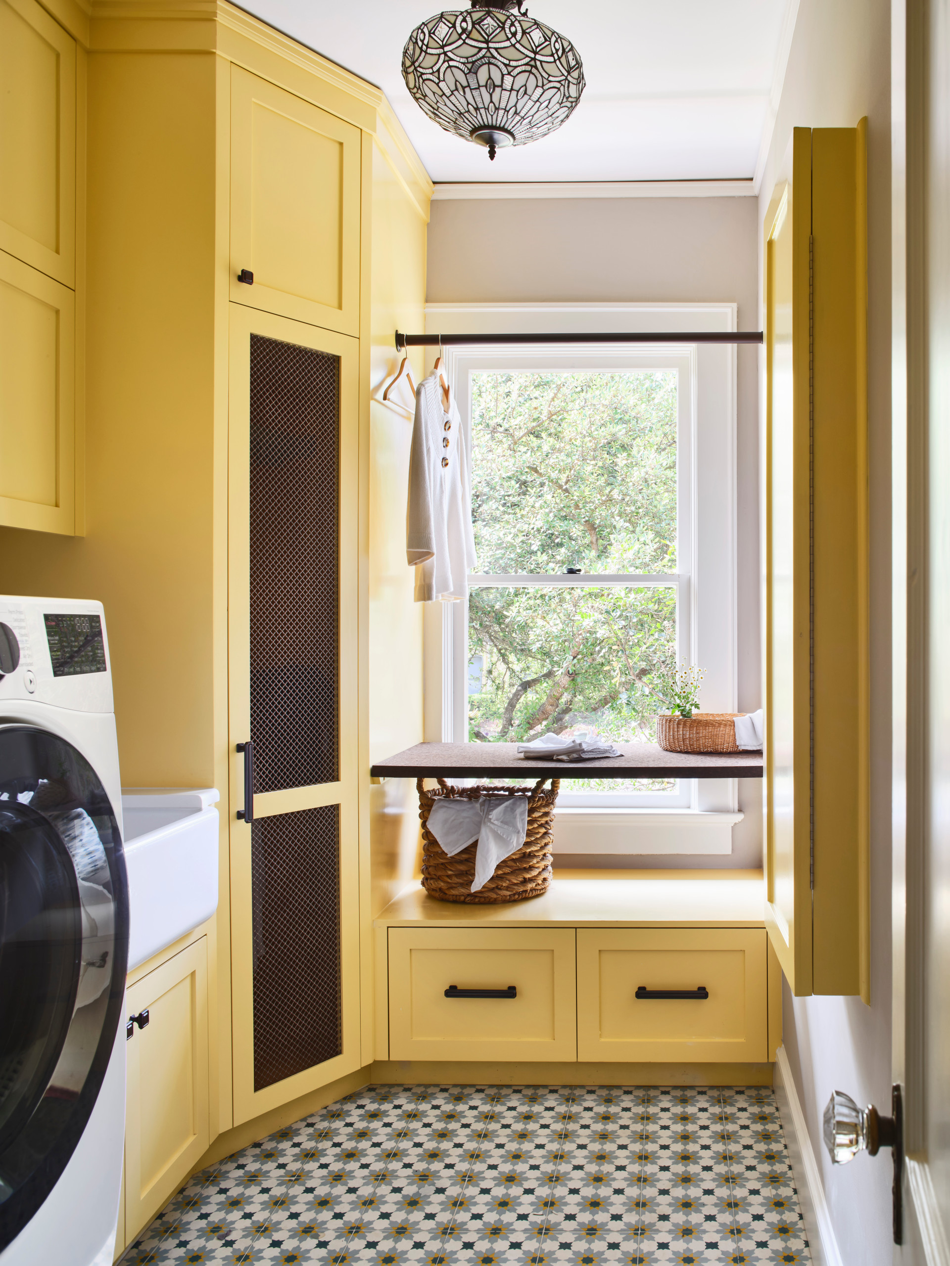 Special features. Vibrant yellow cabinets (Yellow Ground by Farrow & Ball). Encaustic floor tile with touches of blue, yellow and cream. Built-in drying cabinet. Cork folding countertop. Oil-rubbed bronze flush-mount light fixture.