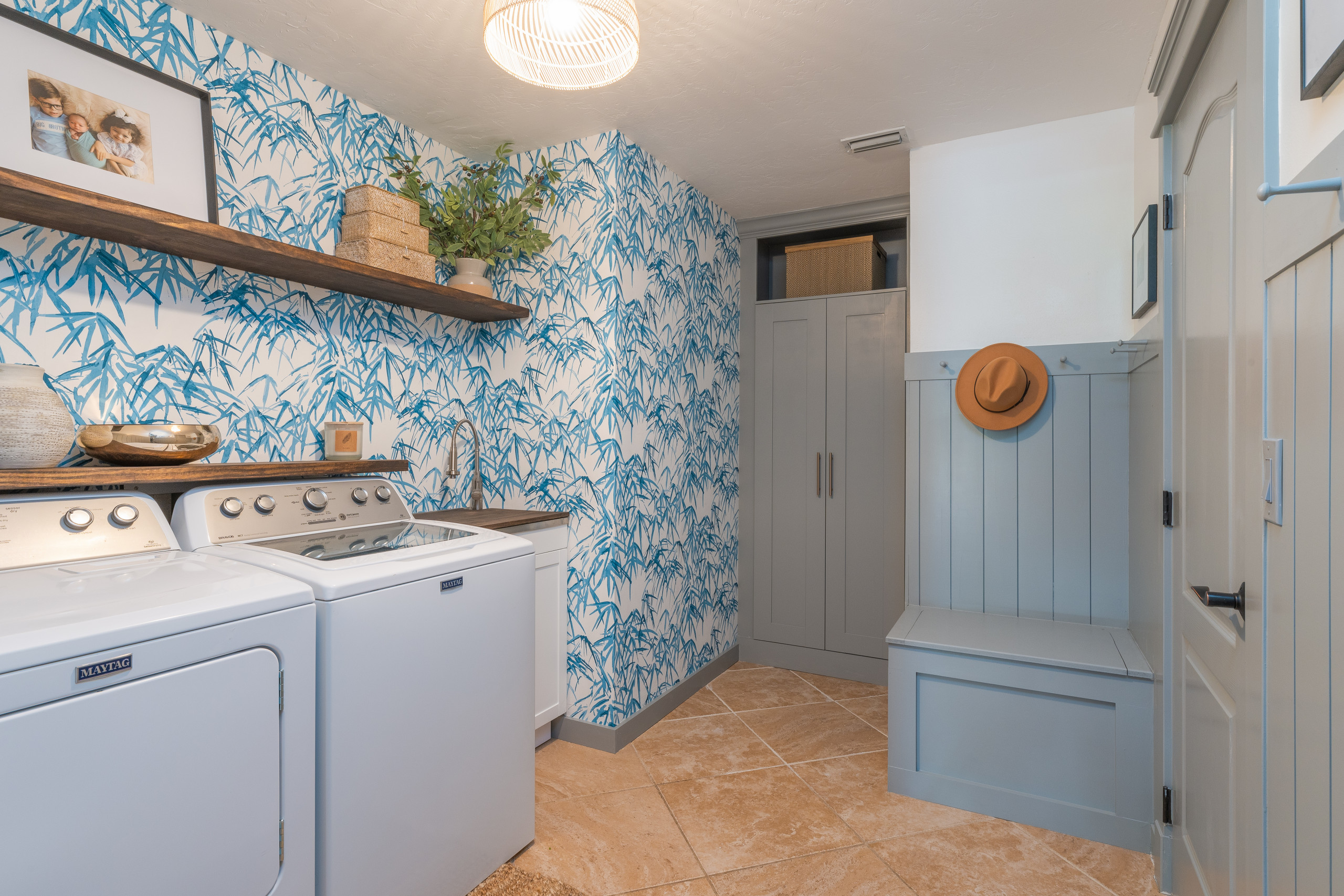 “They didn’t have the budget for custom cabinetry in this room, so we took an Ikea cabinet and added additional trim and extended the height on top to make it look like a custom built-in. We also added additional storage under the bench seat for backpacks and larger items. The floating shelves were a major accent item for this room, so I came up with the idea to add a matching removable wood top over the laundry sink to tie it all together, giving them extra counter space when the sink wasn’t being used.”