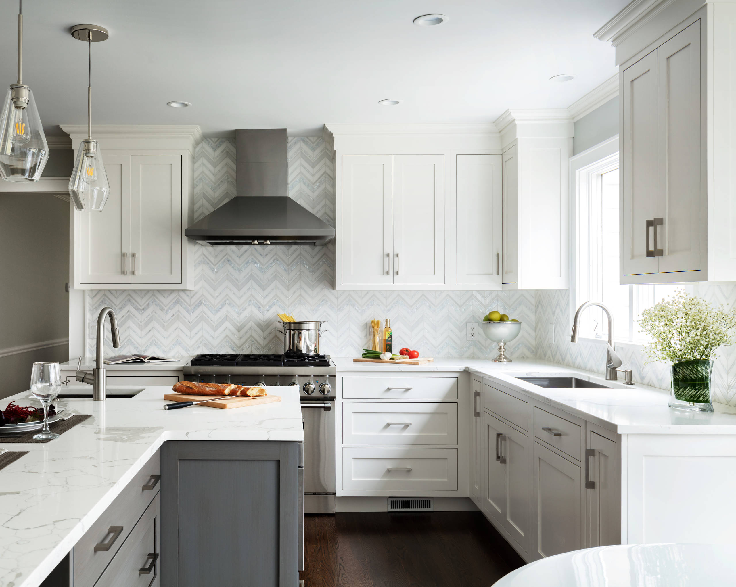 Special features. Thassos marble backsplash with mother-of-pearl inlay in a chevron pattern. Quartz countertops that look like marble. Concealed-hinge cabinets.