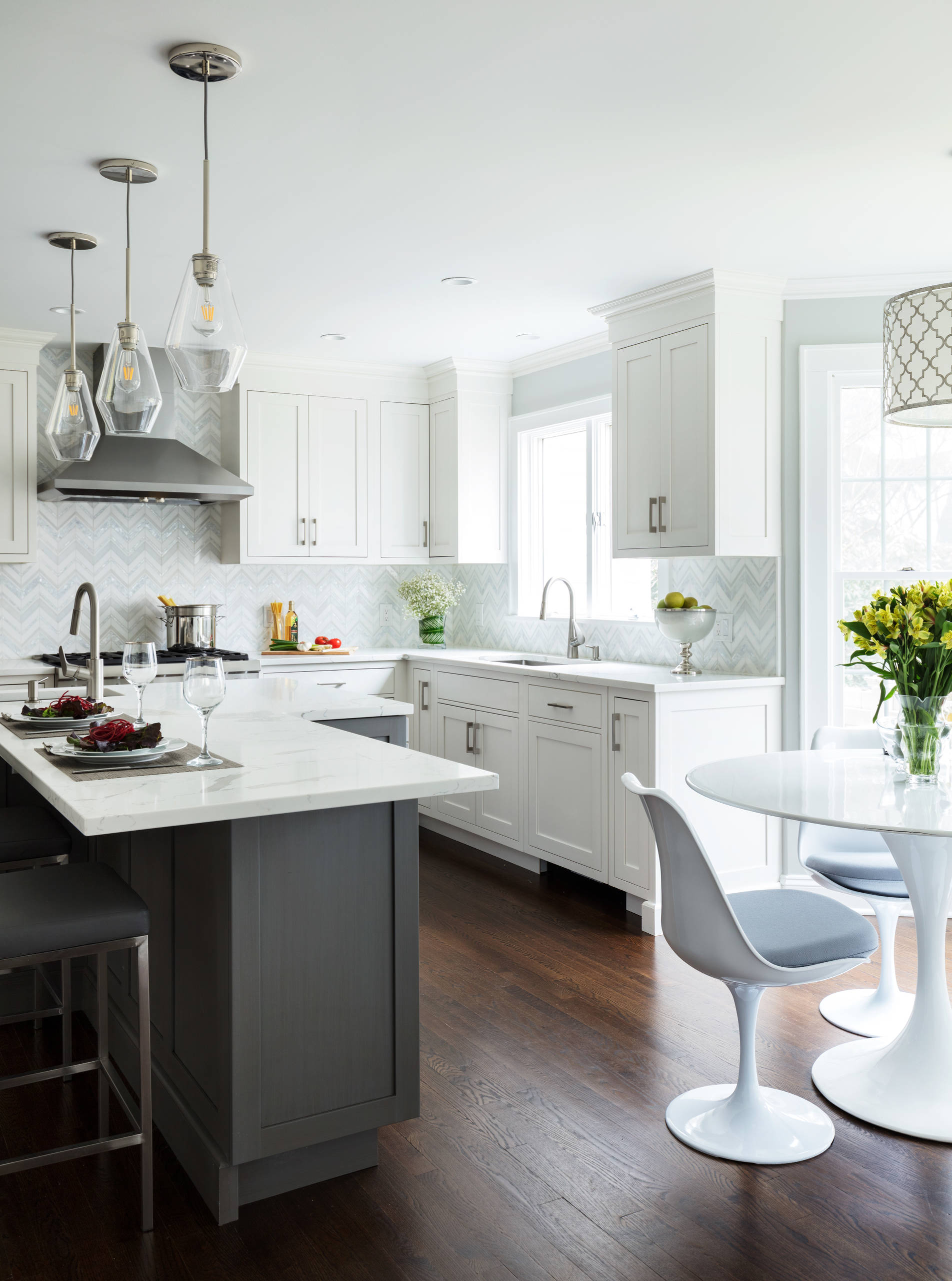 Homeowners’ request. A large, functional kitchen in a clean, bright transitional style. A dining table was a must.