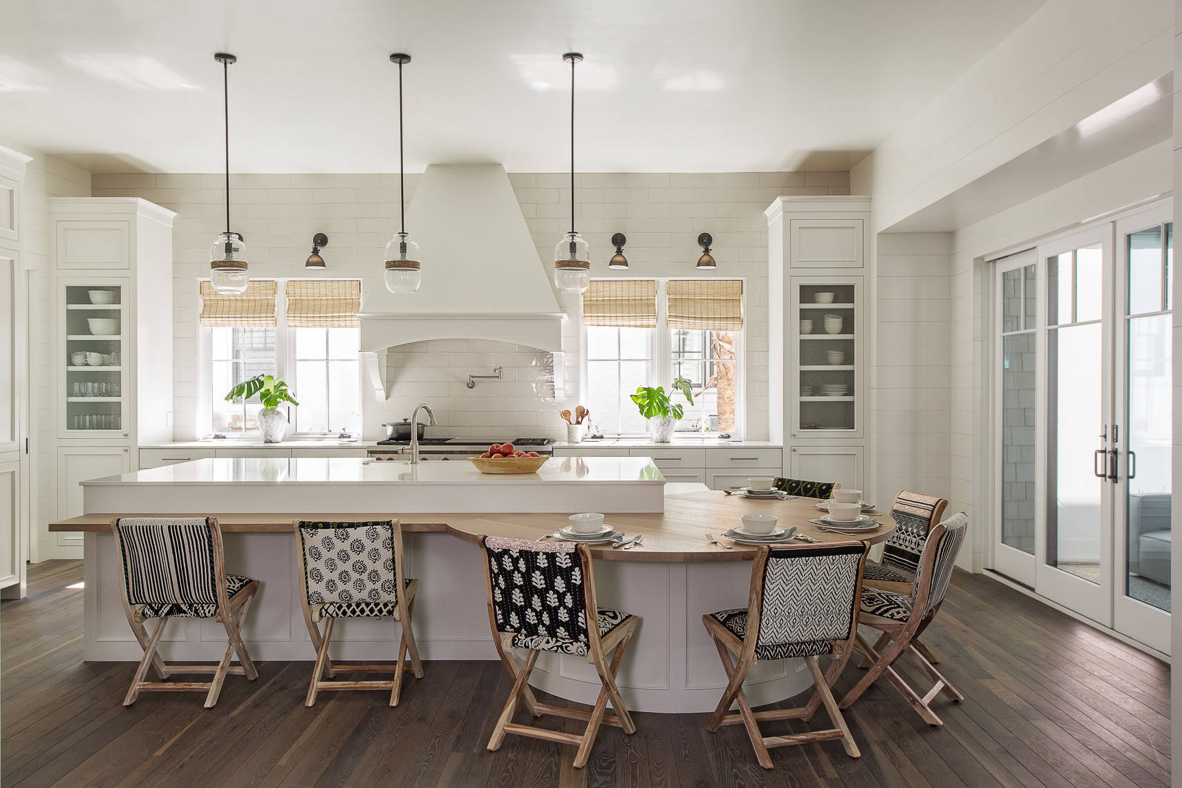 Island shape. An attached wood table and bar counter offers plenty of extra seating for casual meals and for kids to do homework while the adults cook.