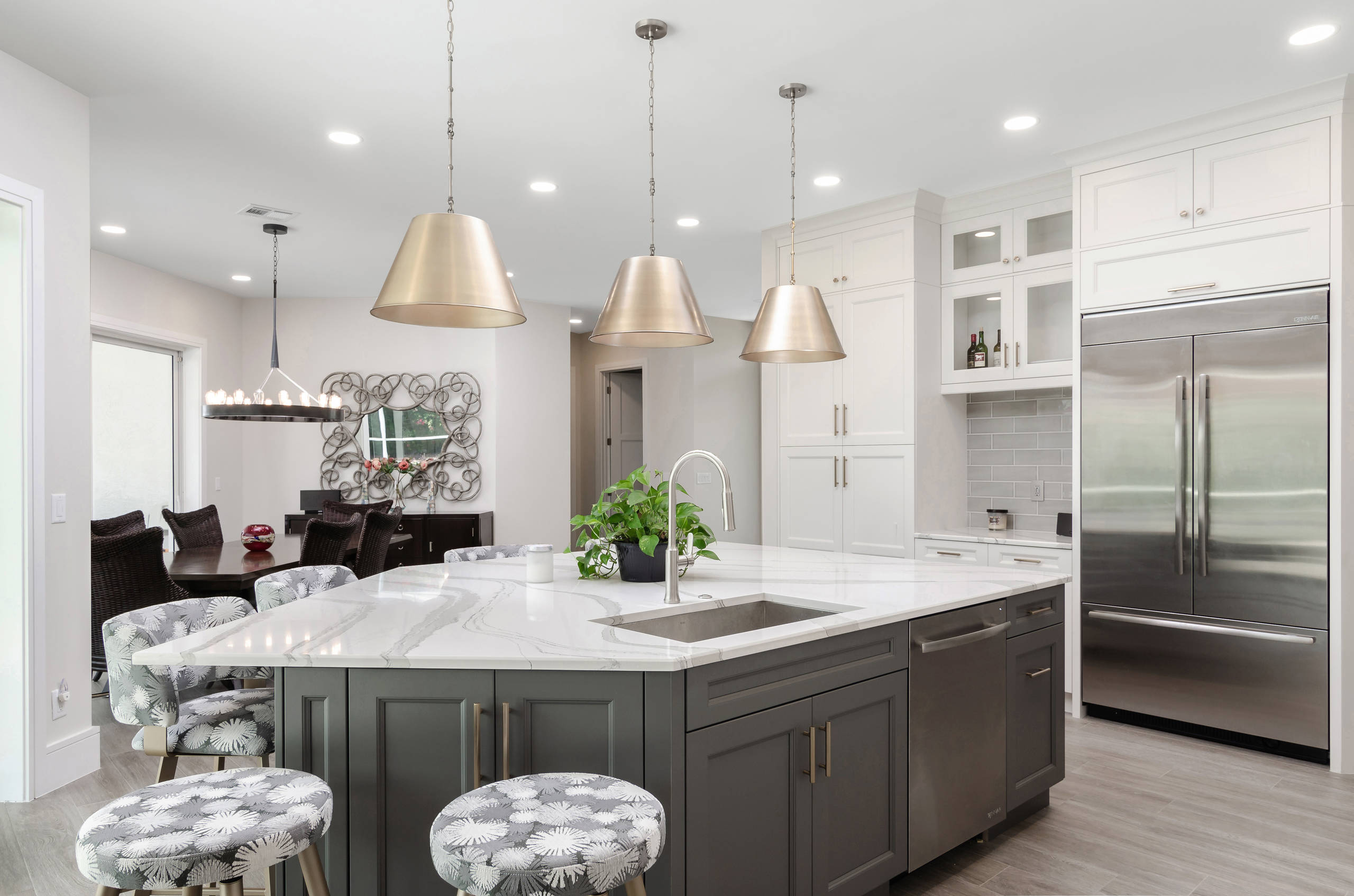 Island shape. “The island shape is made up of applying a triangle-shaped section to the end of a rectangle-shaped section,” says designer Robert O’Neil. “The design was for a combination of functionality and aesthetics. Due to the shape, two additional bar stools are able to be added, and the countertop follows the exterior wall for a nice clean look.”