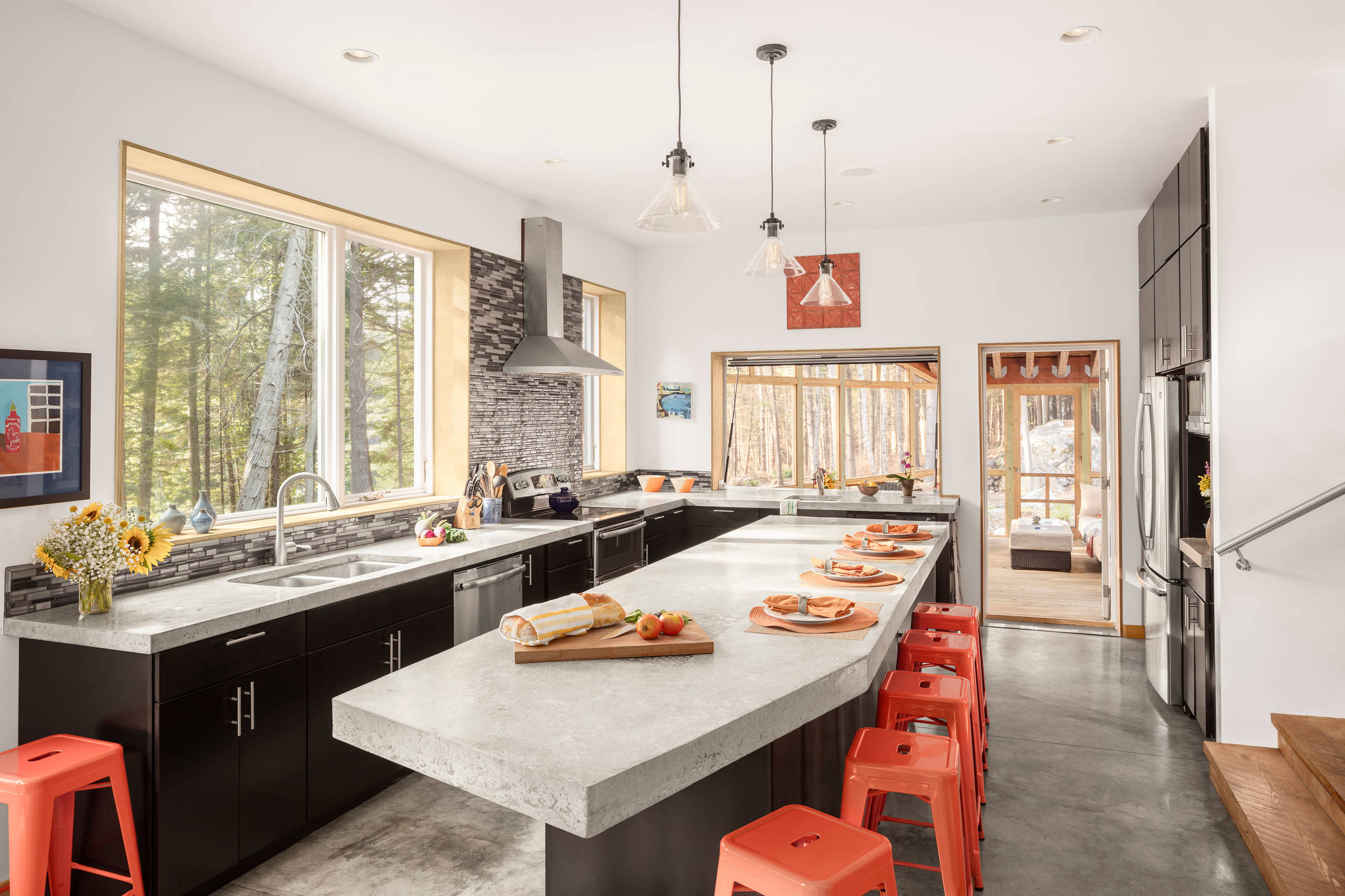 Special features. “Geek alert,” Kaplan says. “The concrete countertop is 4 inches thick and has a special code set into it from the ASCII binary character table, which spells out the house’s nickname, Plus Sapins ("more pines” in French).