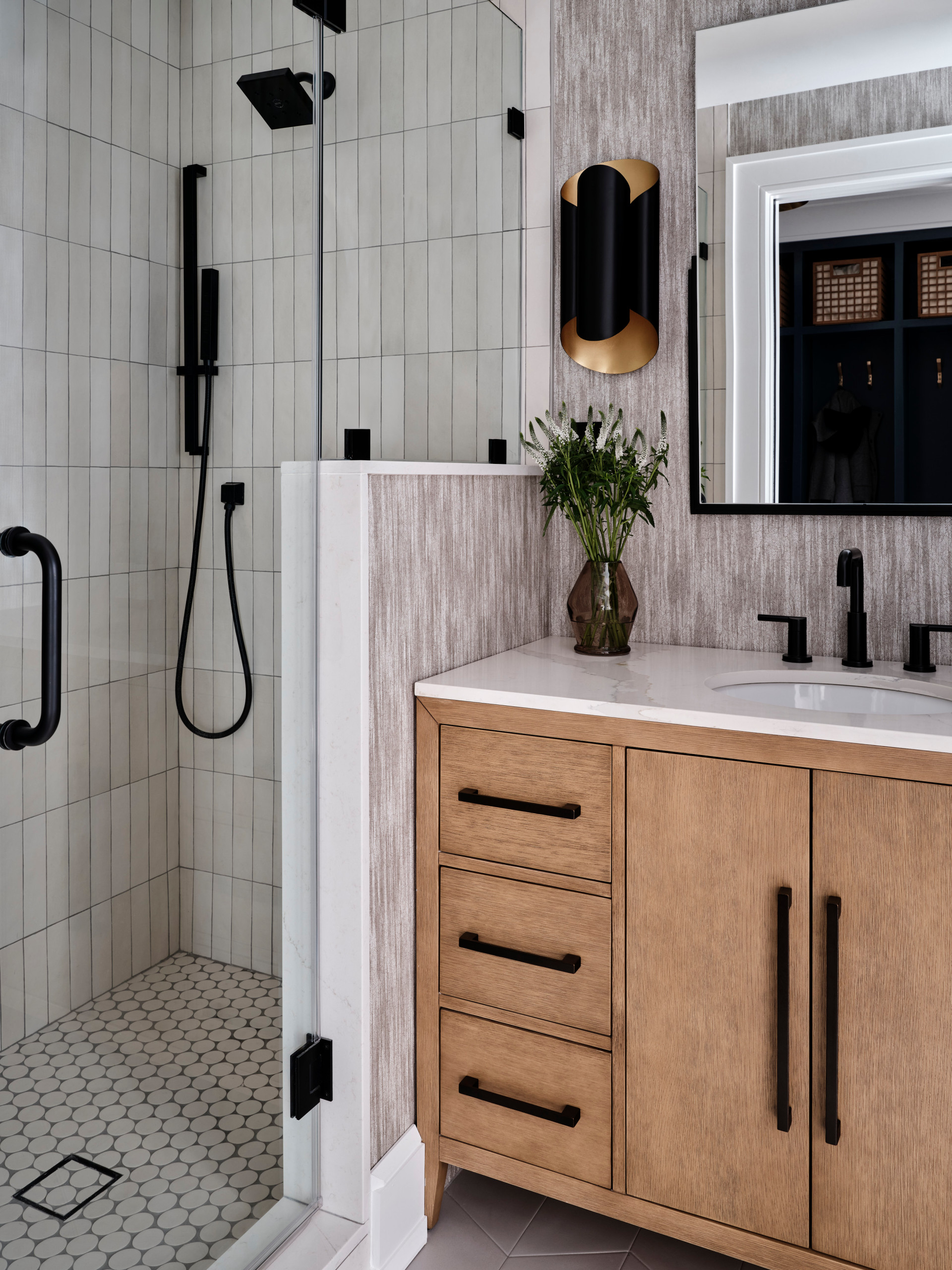 Other special features. “The warm wood tones of the vanity play off the cool white-and-gray tiles, and the black hardware gives the space a little bold kick,” Ianno says. “The walls outside the shower are wallpapered with Phillip Jeffries’ Vinyl Stingray.”