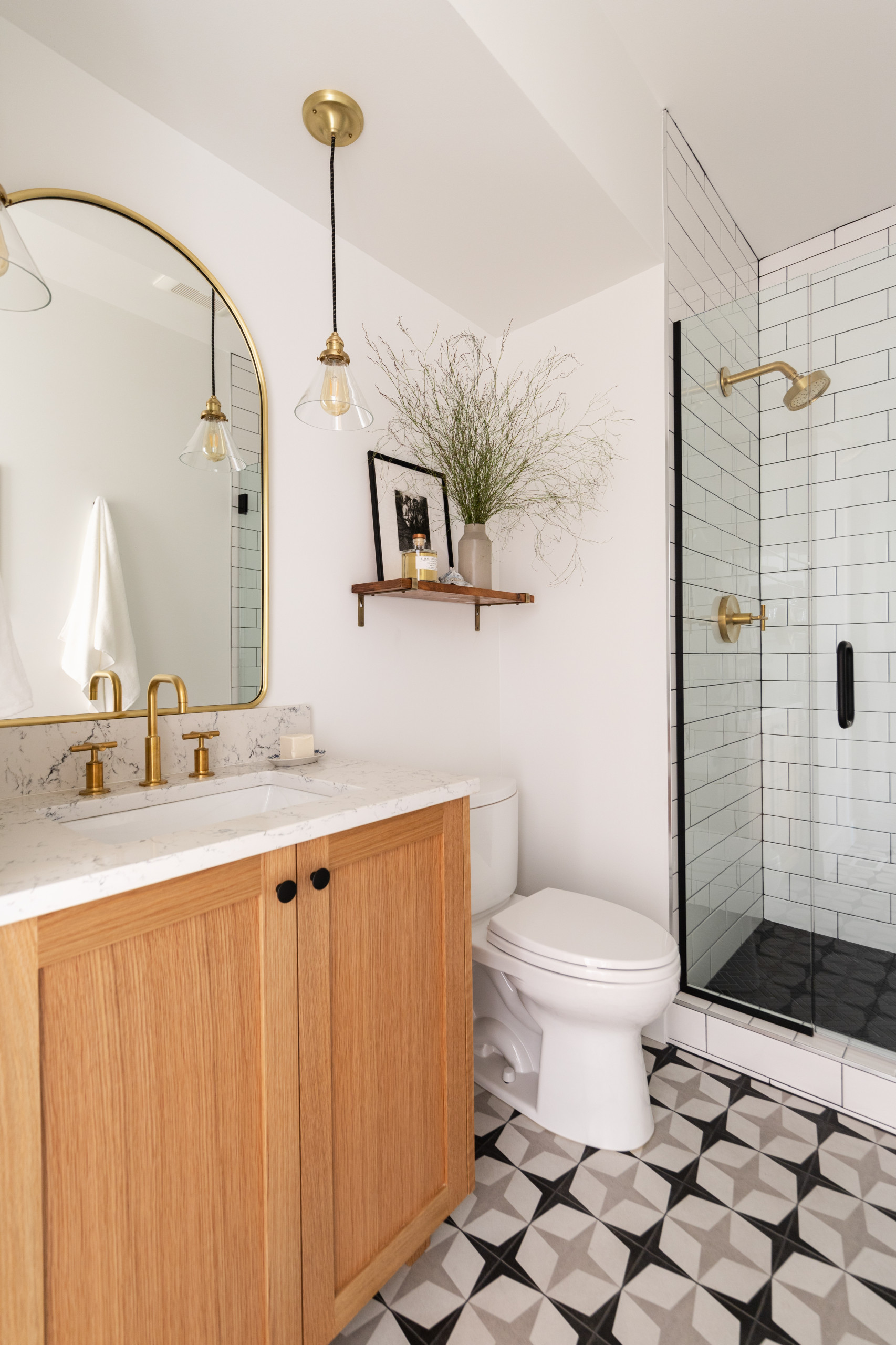 Other special features. “With a black-and-white tile palette, we wanted to warm up the space with a rift-cut white oak wood custom vanity,” Haren says. “We also dialed up the warmth with the Kohler Purist plumbing collection in brass. To add extra dimension to this bathroom, we went with two hanging light pendants flanking the mirror. We also added a floating walnut shelf with brass brackets above the toilet to hold both decorative and functional smaller items.”