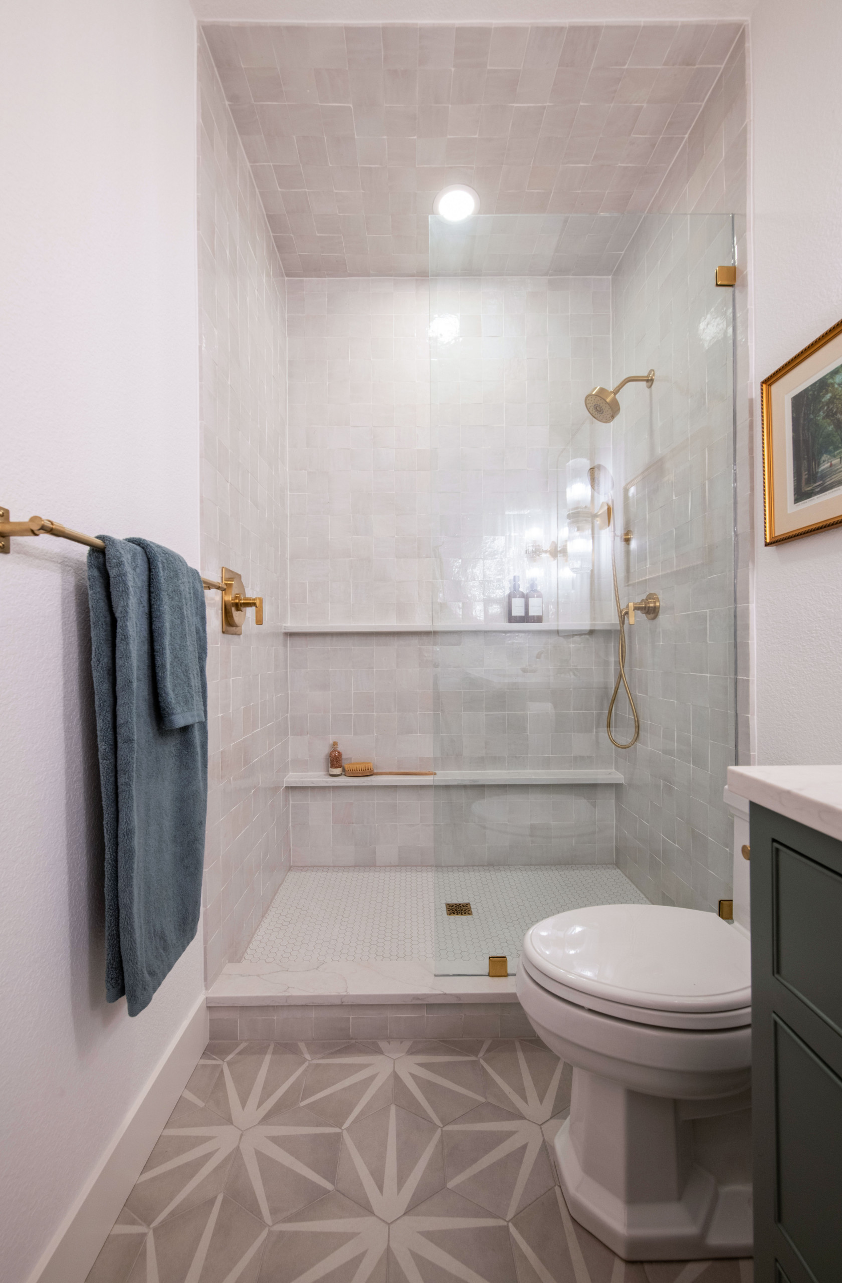 “Uh-oh” moment. “Zellige tiles can pose a challenge for tile installers due to their perfectly imperfect nature,” Lauer says. “These tiles are not uniform in size and often lack straight edges. For our detailed shower design, it was imperative that the tiles aligned perfectly with the horizontal row of tiles. Our installer had to meticulously cut each horizontal tile to ensure that the grout lines matched up seamlessly. Although this process was time-consuming, the final result was well worth the extra effort.”
