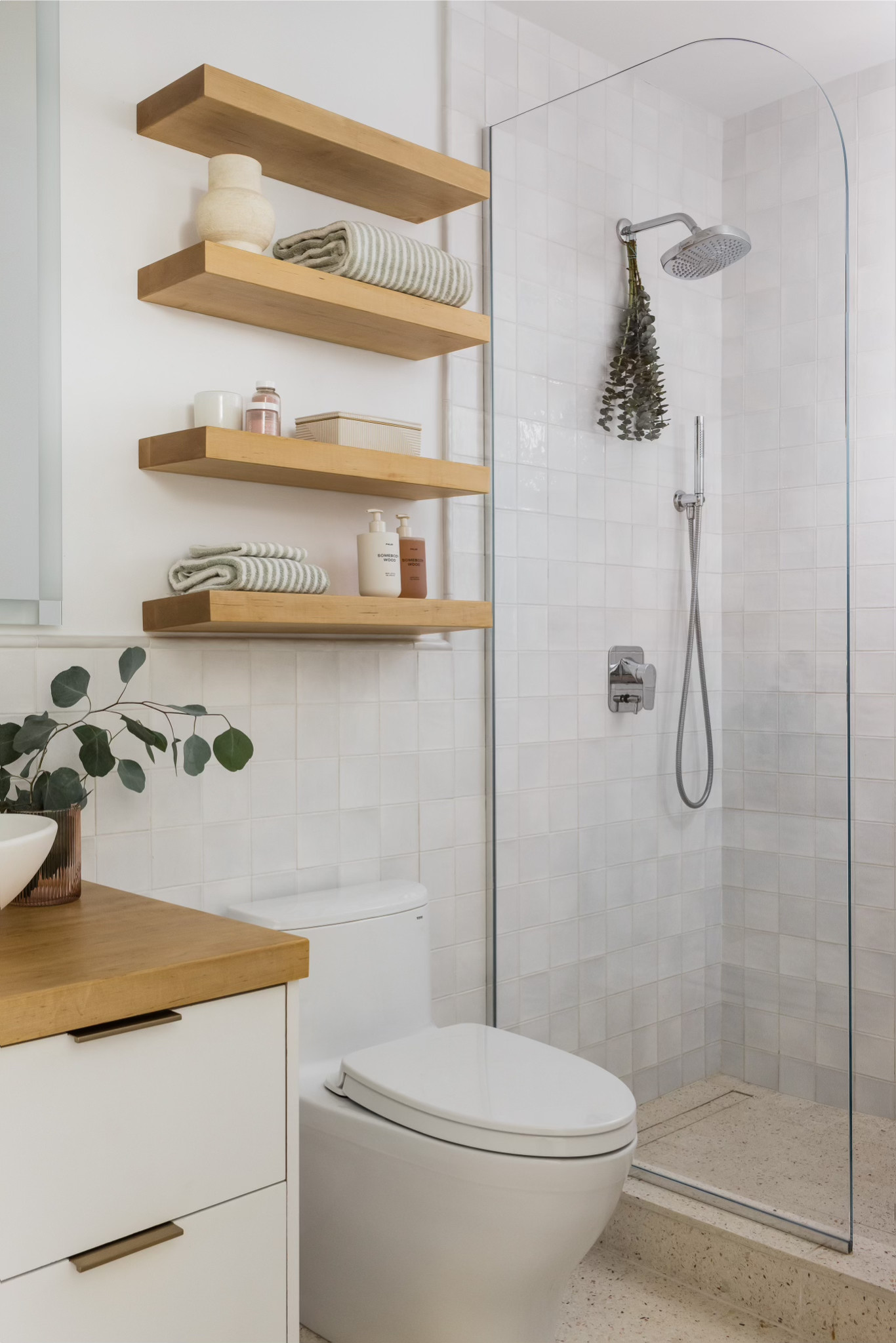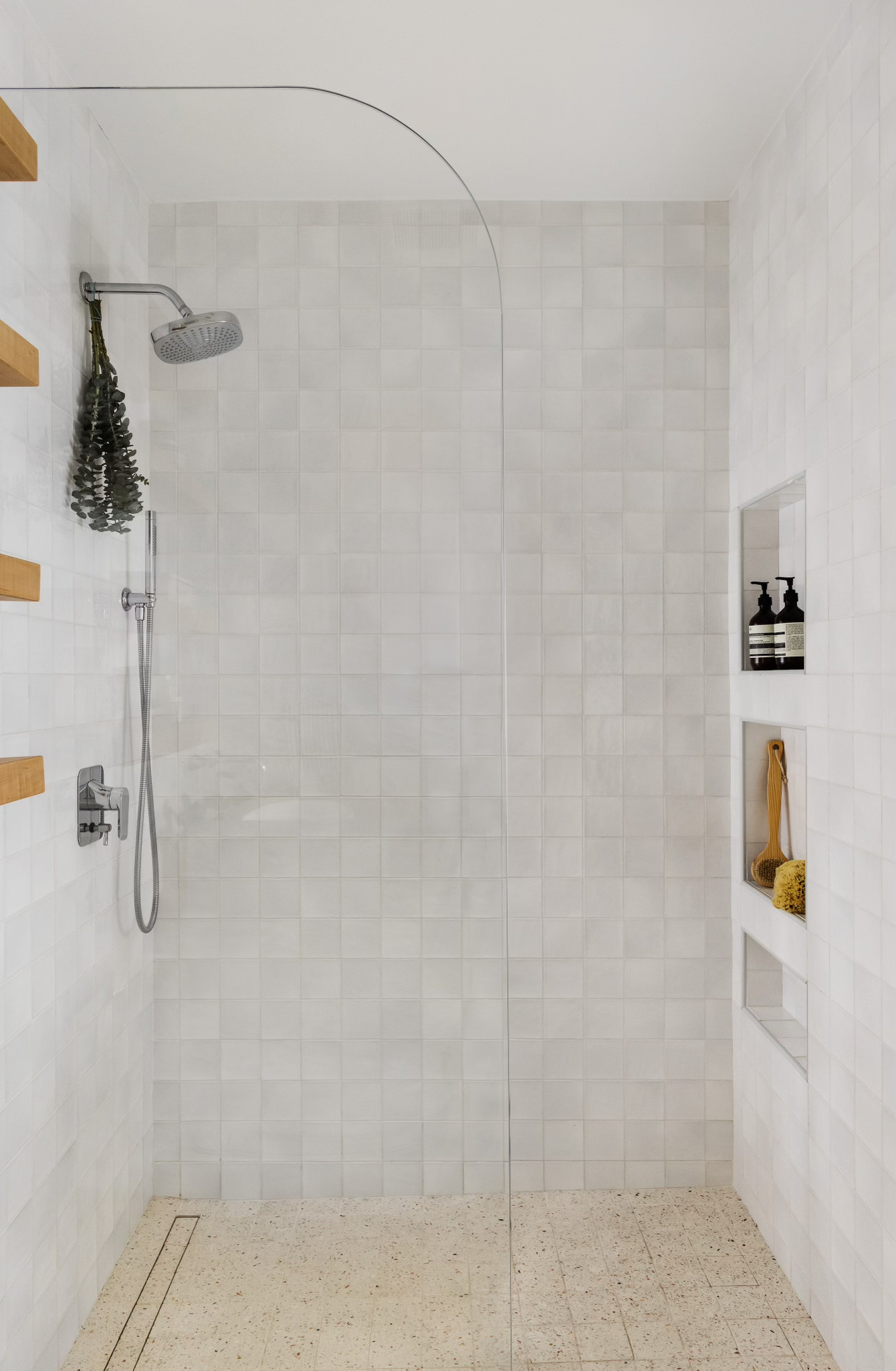 Other special features. “We wanted an earthy, contemporary feel and aesthetic,” McGreavy says. “To achieve that, we opted for a zellige-style wall tile, terrazzo floors and a wood vanity to bring in some warmth. While maintaining the earthy look, we also wanted the space to feel bright, so we went with our tried-and-true Benjamin Moore Chantilly Lace on the walls. Other special features include an electric mirror, a low shampoo niche for shaving, and two other niches for storage of showering essentials.”