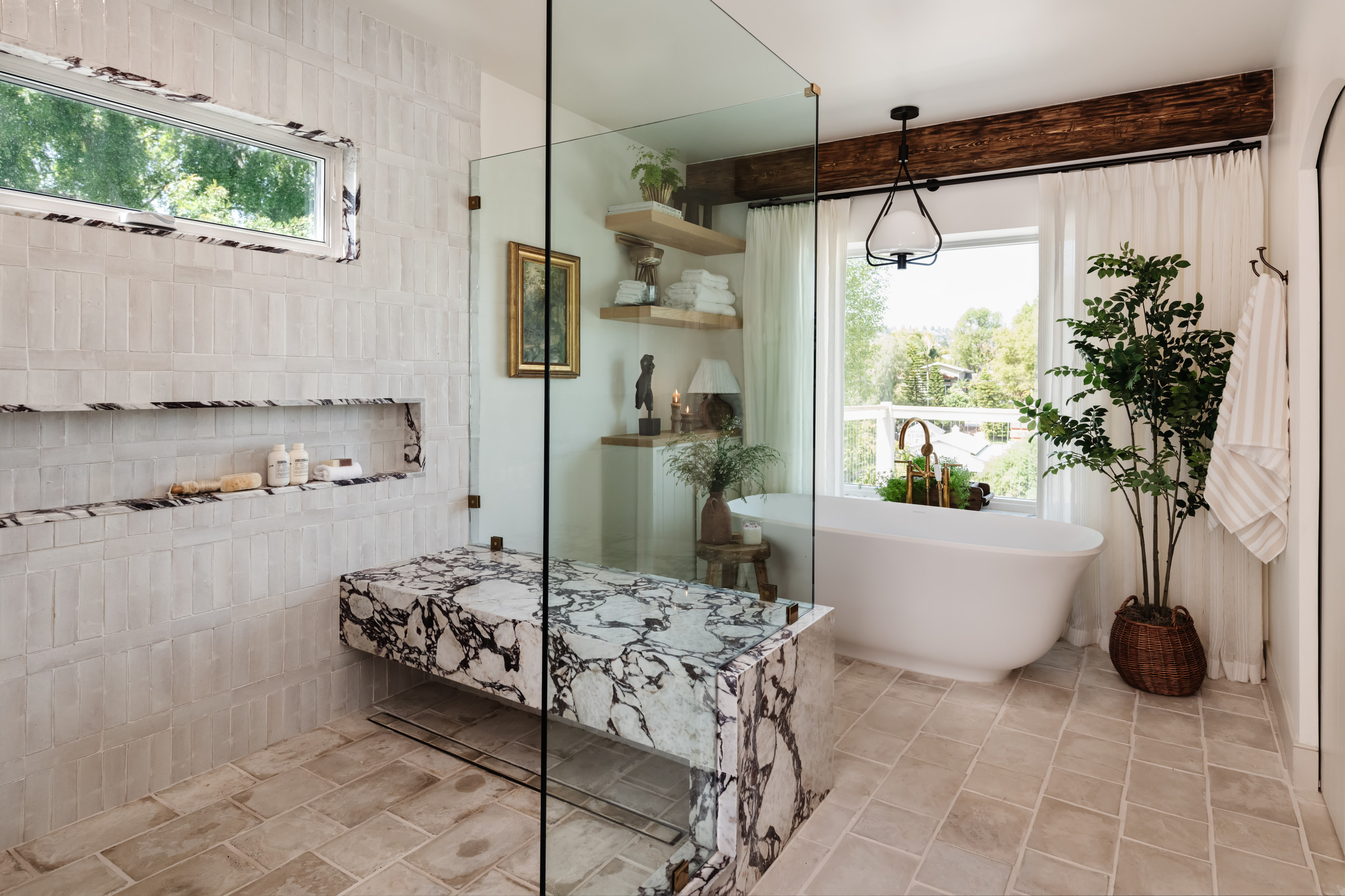 Shower details. Calacatta Viola marble curb, built-in bench and other details. White handmade zellige wall tiles. Handcrafted floor tiles in multiple sizes. “We incorporated a low-curb shower to enhance both functionality and aesthetics,” Lauer says. “By extending the same bathroom floor tile into the shower pan, we aimed to create a seamless, expansive look that makes the space feel significantly larger. To add a touch of contrast and visual interest, we chose to use a marble slab for the curb, which beautifully complements the overall design.”