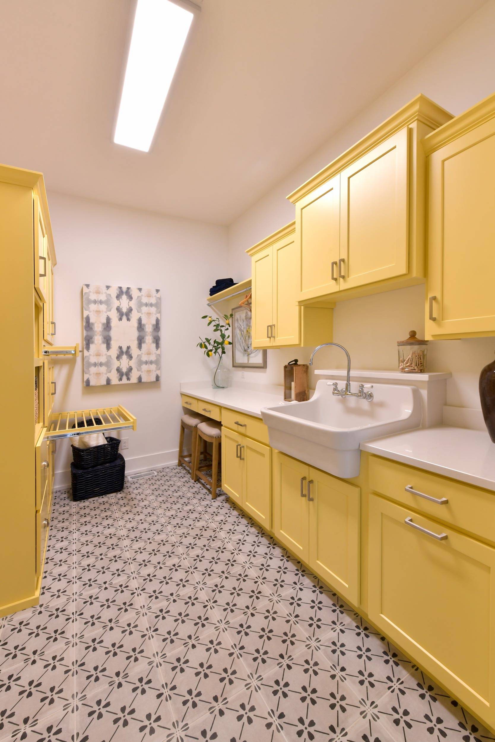 Special features. Sunny yellow cabinets (Classical Yellow by Sherwin-Williams). Patterned floor tile. Vintage country-style sink and faucet. Integrated drying racks. Folding counter with stools. Quartz countertops. Bar for hanging and drying clothes. (The washing and drying machines now sit across from the sink. They had not been installed when this photo was taken.)