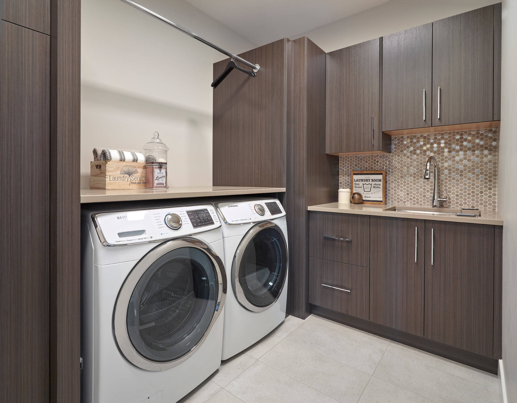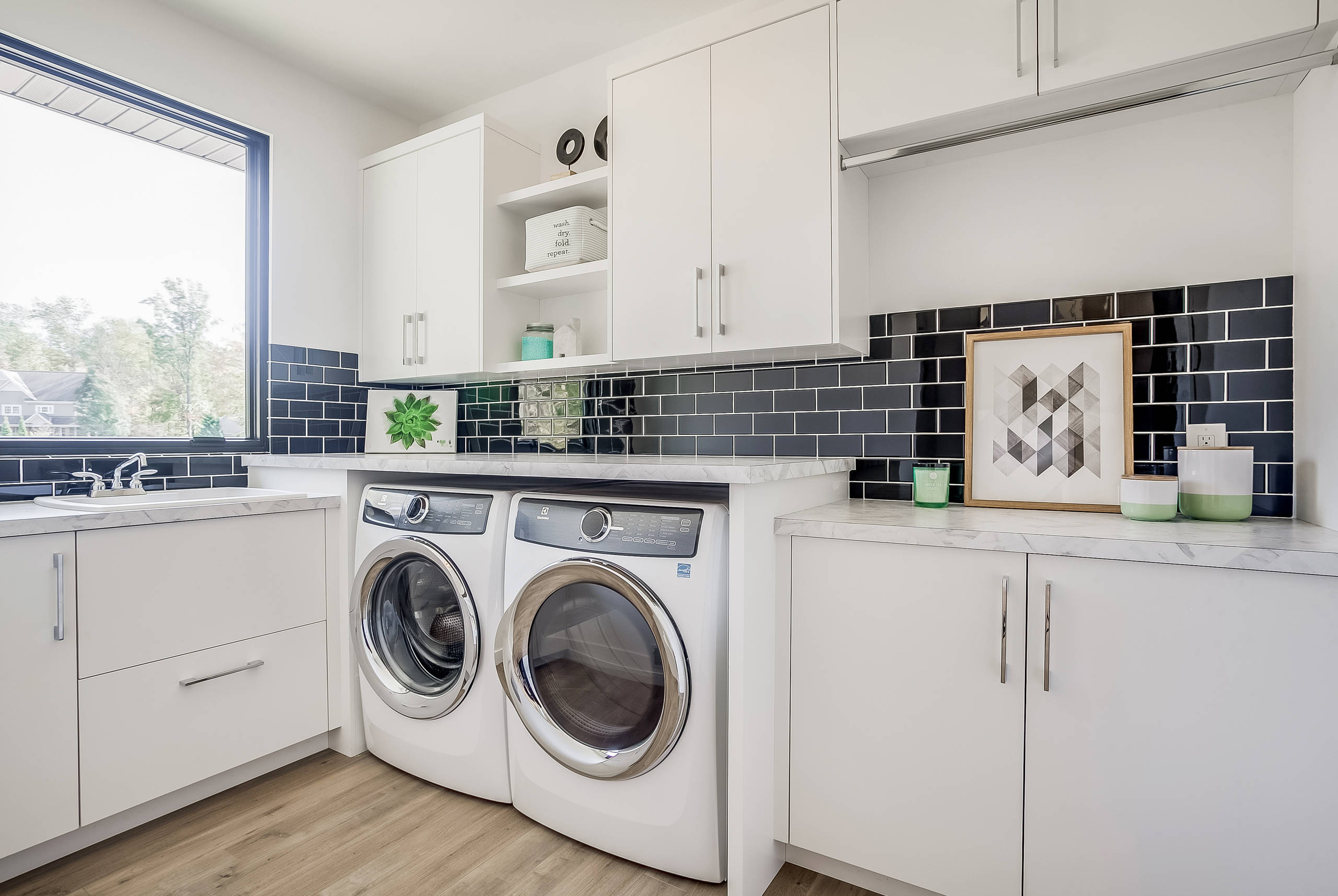Designer tip. “Make sure to select your washer and dryer before designing the space,” Jacobson says. “Every unit has slightly different dimensions, and to get a perfect fit under the countertops, you must know the dimensions.”