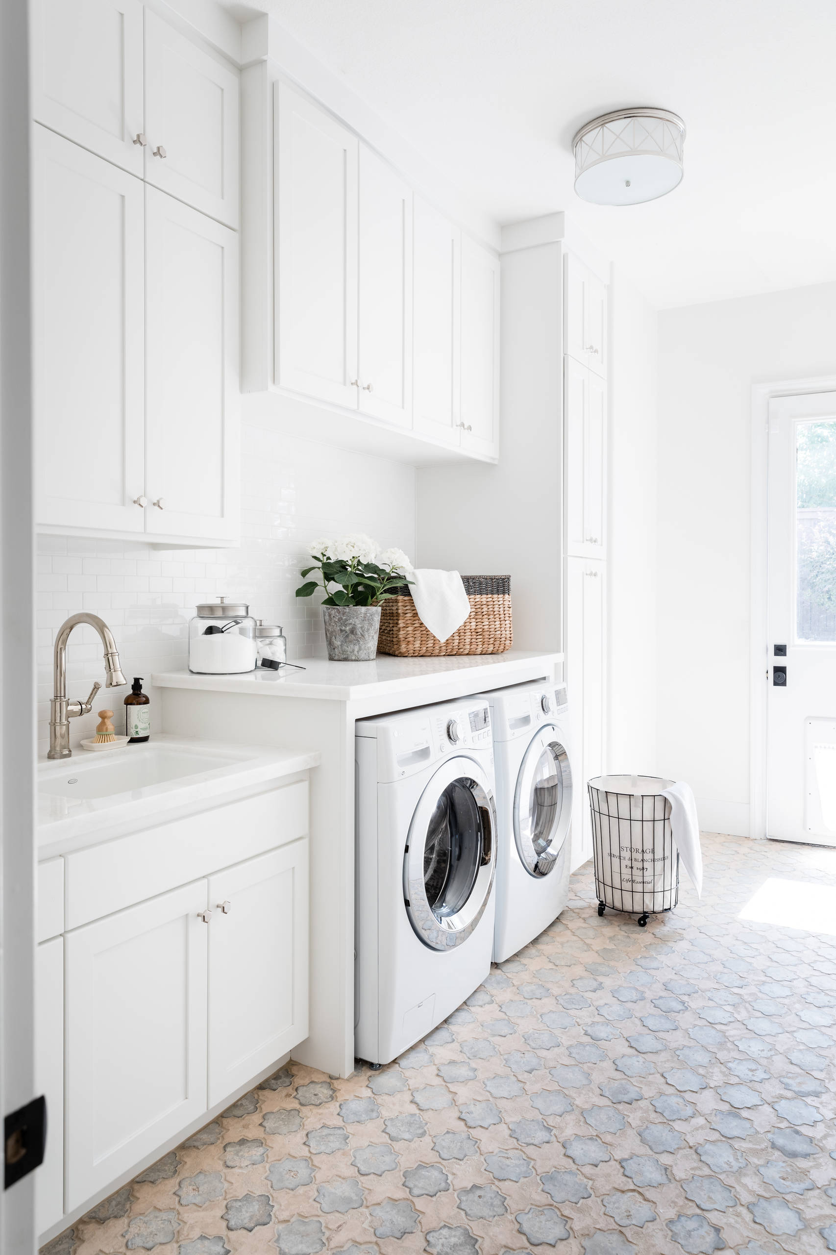 Homeowners’ request. The young newlywed couple wanted a family home full of life and personality. Designer Natalie Myers converted a small bedroom into this spacious laundry room. “Knowing that this would become their family home for at least 10 years, and that they weren’t worried about keeping the design neutral for the future owners, was liberating,” designer Natalie Myers says. “We had fun with color, scale and new materials that were fresh to the market.”