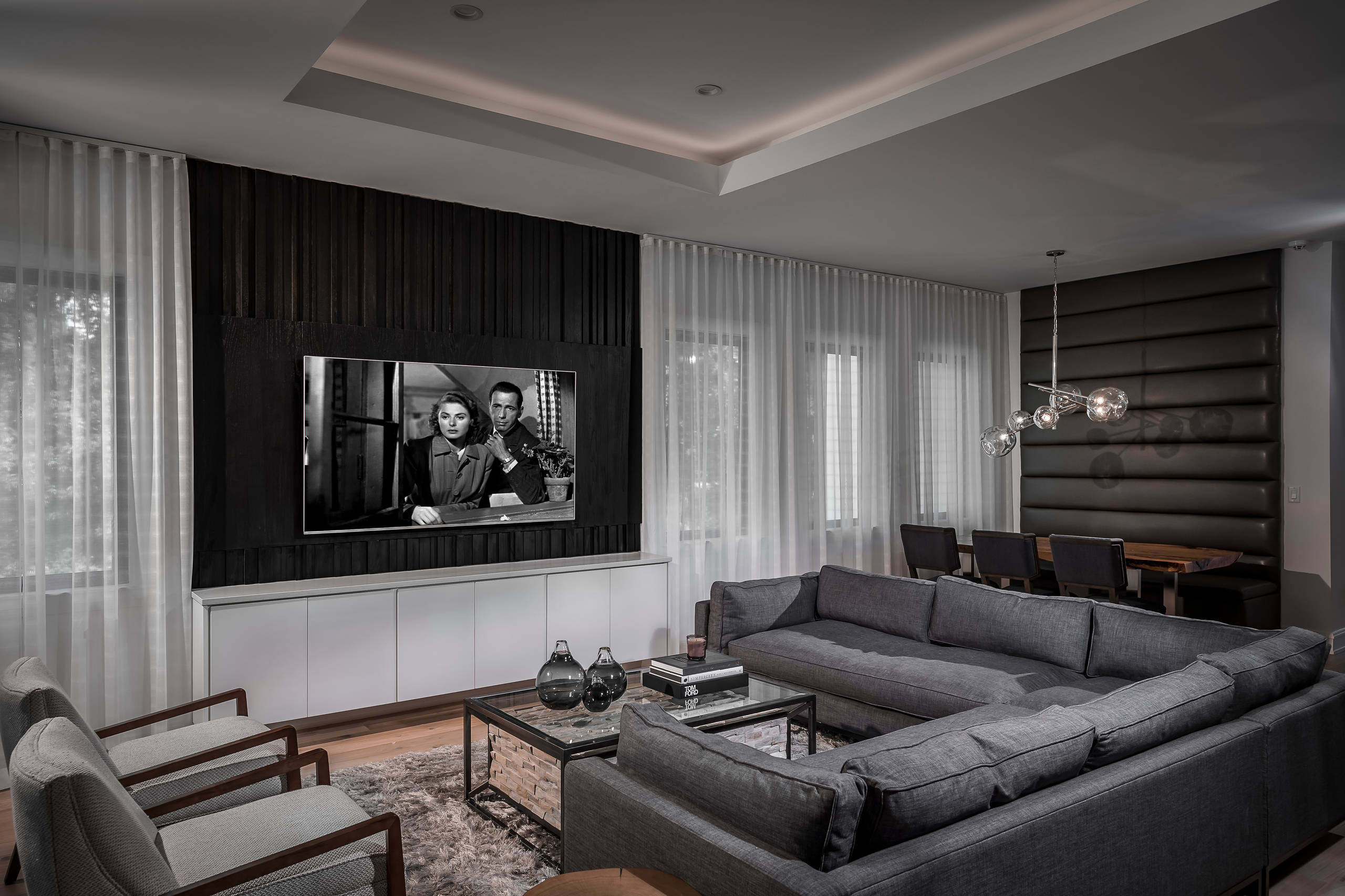 “Uh-oh” moment. “For the design team, the challenge was always how to allow the TV to take center stage — but in a refined way,” Luterman says. “Placing a TV next to a fireplace can lead to competing focal points, and this was the problem to solve. The solution was a split treatment along the entertainment wall. Instead of having one wall surface and a minimal surround for the fireplace, the wall was divided into two floor-to-ceiling applications. The fireplace was lowered to allow for the TV to catch the eye first.