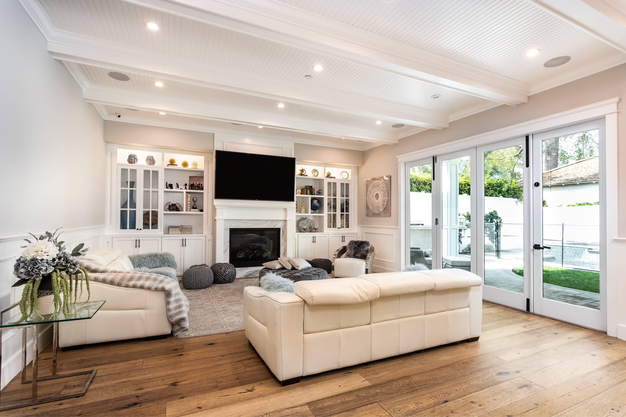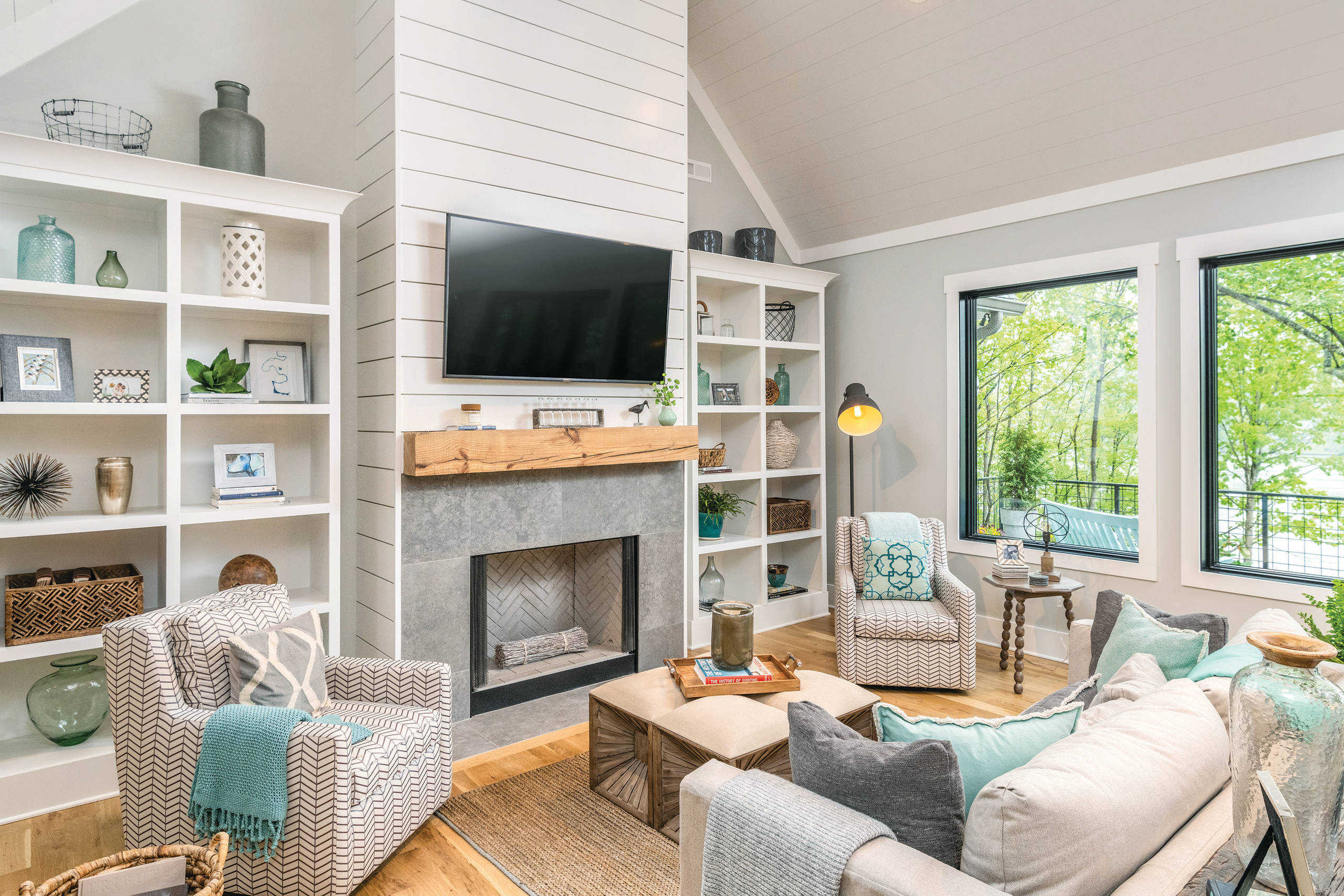 TV placement. The open-floor concept and windows meant Bledsoe had only one wall on which to place the TV. To keep clean lines running throughout the space, she felt the best place to install the TV was out in the open and above the fireplace, rather than hiding it away in the bookcases. White wood planks accentuate the clean lines behind the TV, which can be angled for optimal viewing.