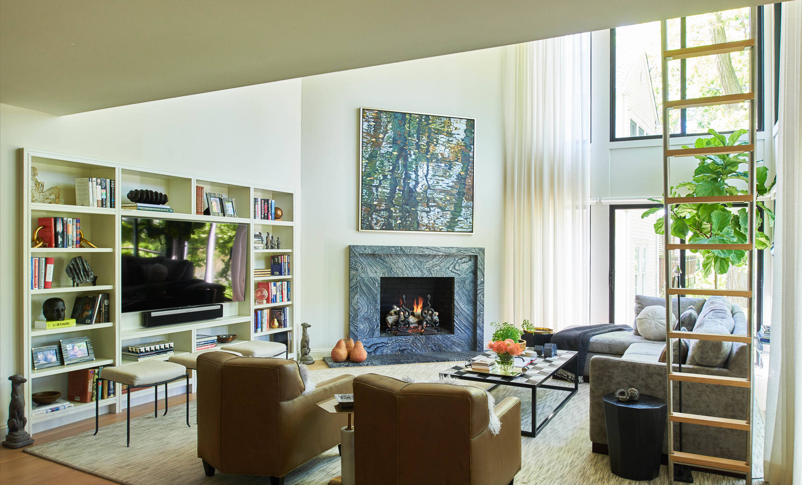 TV placement. “Because most of the room was windows or open to the kitchen, the remaining wall space was what we had to work with,” Levinson says. “The existing fireplace had a raised firebox, which made for ‘above the fireplace’ placement very awkward for viewing. We decided to place artwork above the fireplace. We used the wall opposite the windows to frame a TV inside a built-in bookcase. It kept the focal points of the room — the fireplace and TV — next to each other, and the TV could be placed at optimal viewing height with the center of the TV at seated eye height.”