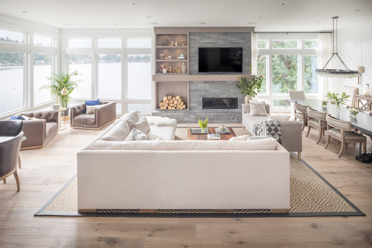 Other special features. The fireplace is clad in rustic silver quartzite. Open shelves help balance the area. White tongue-and-groove paneling in a chevron pattern covers the right wall in the dining area.