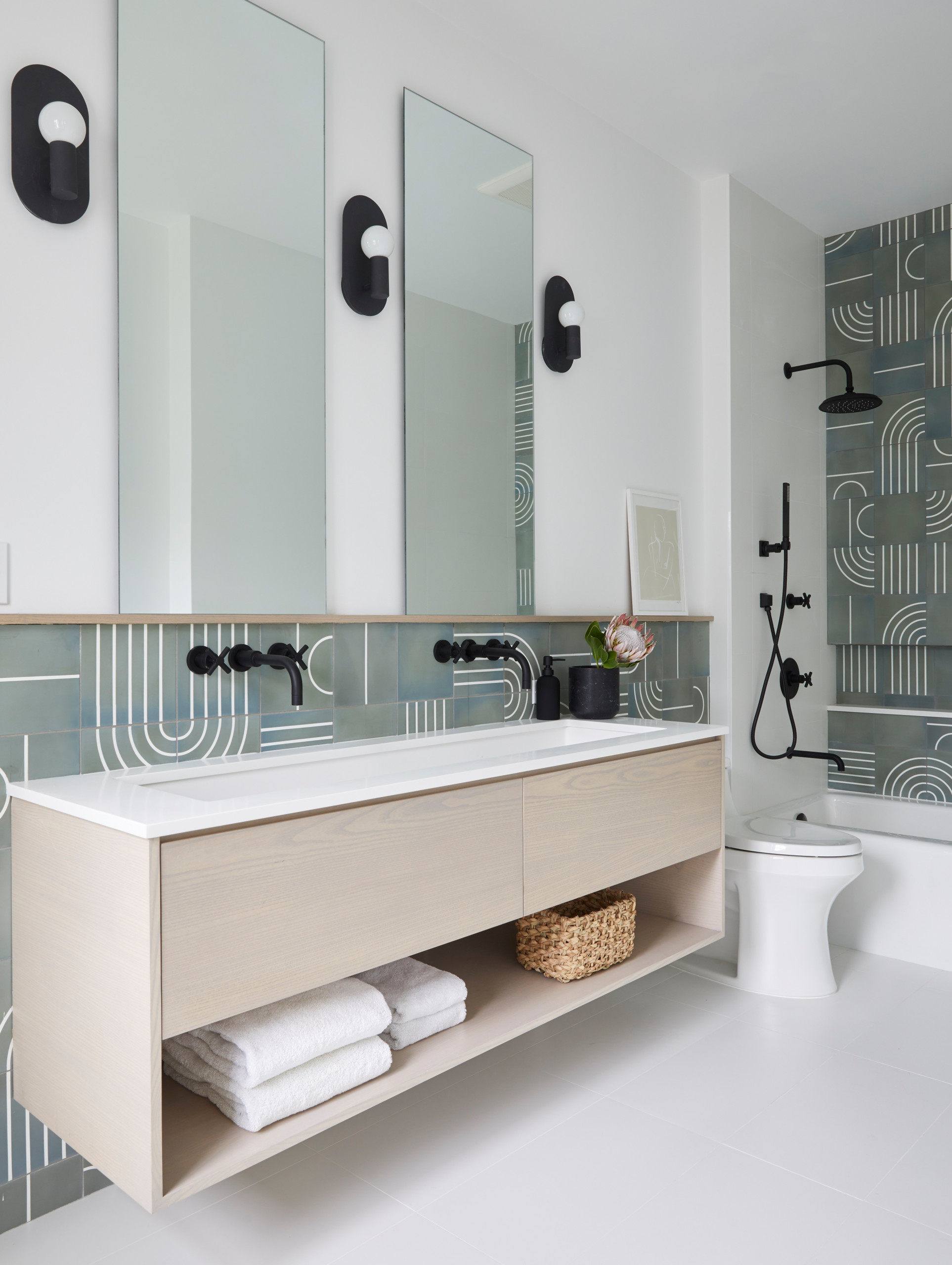Other special features. Custom floating vanity. White floor tile. Matte black fixtures. “Everything was kept simple to help keep the eye focused on the tile,” Sinclair says.