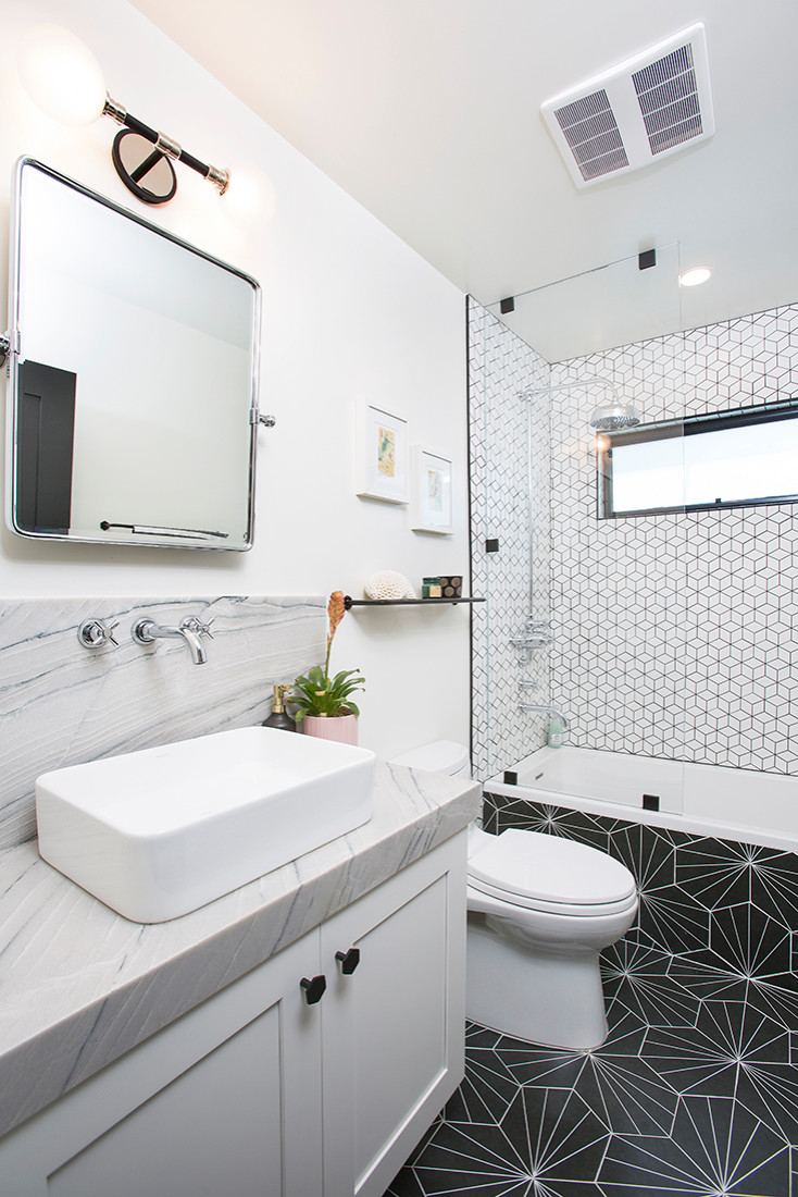 Homeowners’ request. Update the only bathroom inside a midcentury modern home created by famed developer Joseph Eichler in 1953. The small bathroom had been updated in the 1970s to include baby-blue finishes. “Because the space was on the smaller side, we wanted to keep the bathroom light and bright,” designer Karina Marshall says. “These homes have a cult following, and it was important to keep the essence of Eichler’s architect designs in the space. We had to ensure the bathroom fit seamlessly with the rest of the updated midcentury modern home.”
