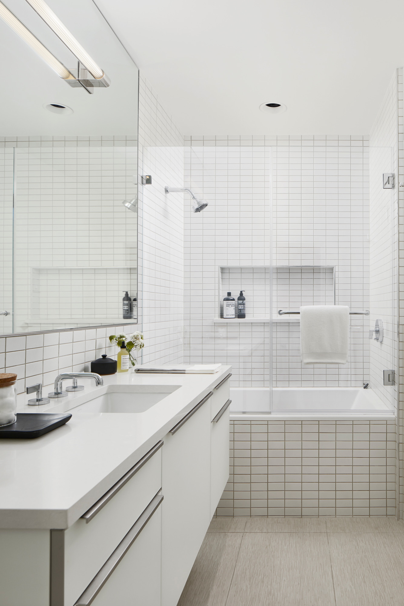 Homeowners’ request. “We did not have a lot of opportunity to change the layout due to the small and restrictive space,” designer Heidi Caillier says. “We wanted to keep the finishes simple but effective, so we chose a muted palette. The homeowners desperately needed storage, so we added a small vanity [and an] inset medicine cabinet, and then did a floor-to-ceiling skinny integrated cabinet next to the bathtub.”