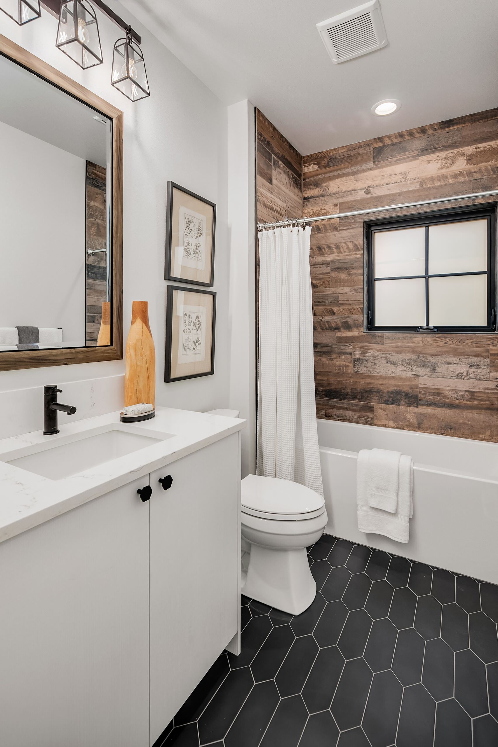 Other special features. “The window in the shower is such a beautiful focal point,” Lynch says. “I usually do niches and accents in the shower, but the window stole the show, so I simply had my tiler run the wood-look plank tile horizontally all the way to the 9-foot ceiling. I wanted the floor to be something that leads you in, so I ran the matte black elongated hex tile perpendicular to the tub. The wood-look mirror perfectly matches the shower tile, and the black hex knobs are a nod to the floors. The result is a harmonious modern-farmhouse bath.”