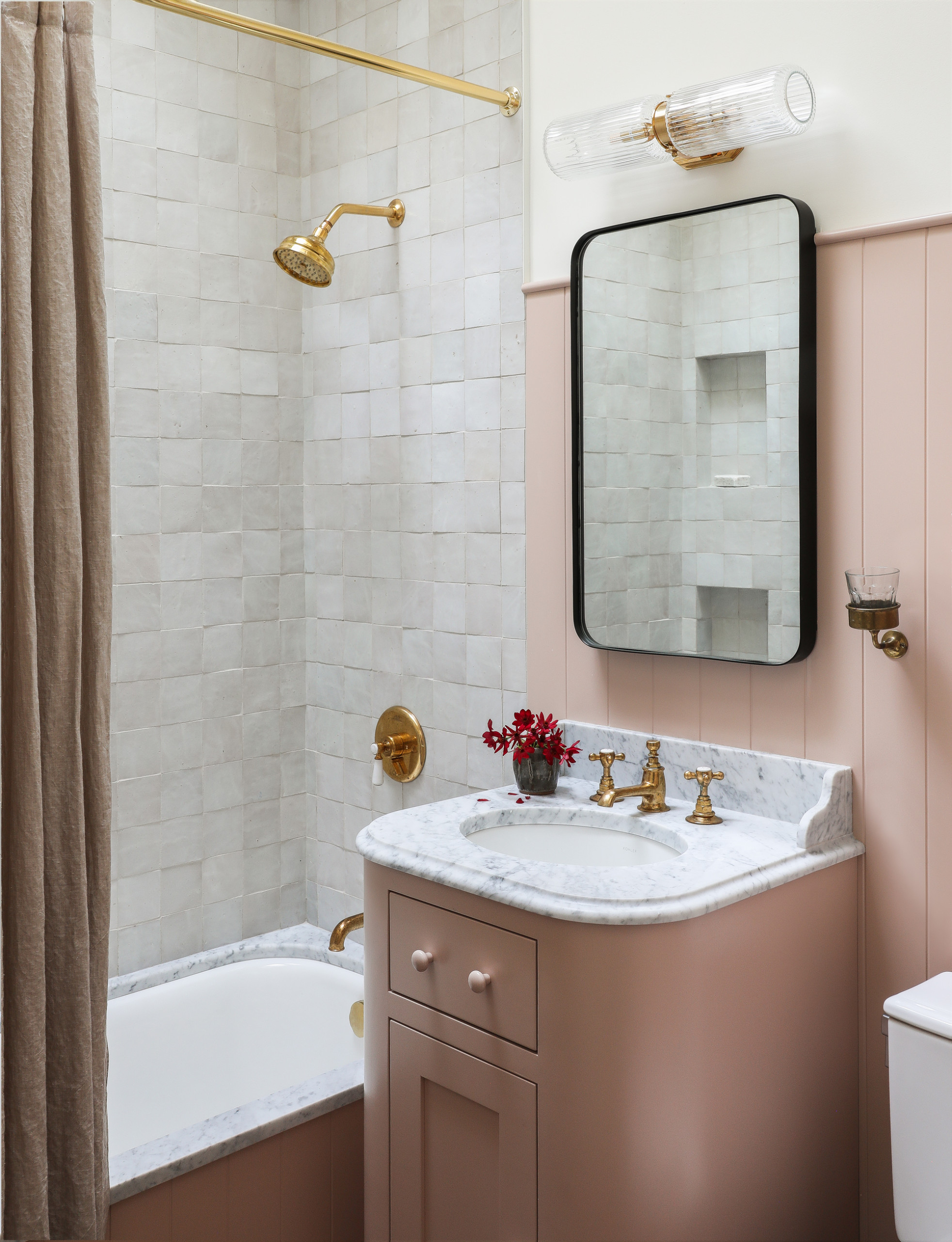Shower-tub features. Handmade tile. Gold-colored fixtures. Blush-colored wall paneling and tub apron (Setting Plaster by Farrow & Ball). “I like to keep at least one bathtub in a house, and this was the only one, so we kept it,” Caillier says. “People like to take baths, and it is good for resale value. I also like the traditional look of a shower-tub over all of the big modern showers everyone is doing now. People have bathtubs for a reason.”