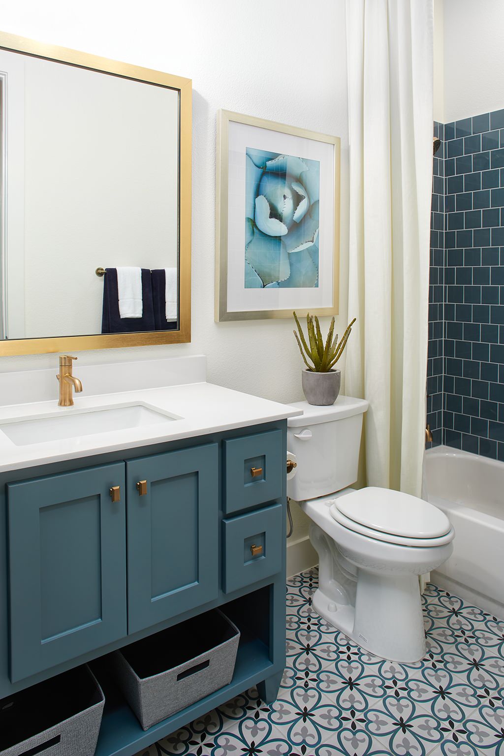 Other special features. Graphic floor tile. Blue vanity (De Nimes by Farrow & Ball). Brass accents. “We really wanted to highlight the patterned tile of this room, so showcasing it with hues of matching blue tones seemed like the perfect way to go,” Shaddock Cesare says. “This was particularly successful with the bright white details and the brass hardware.”
