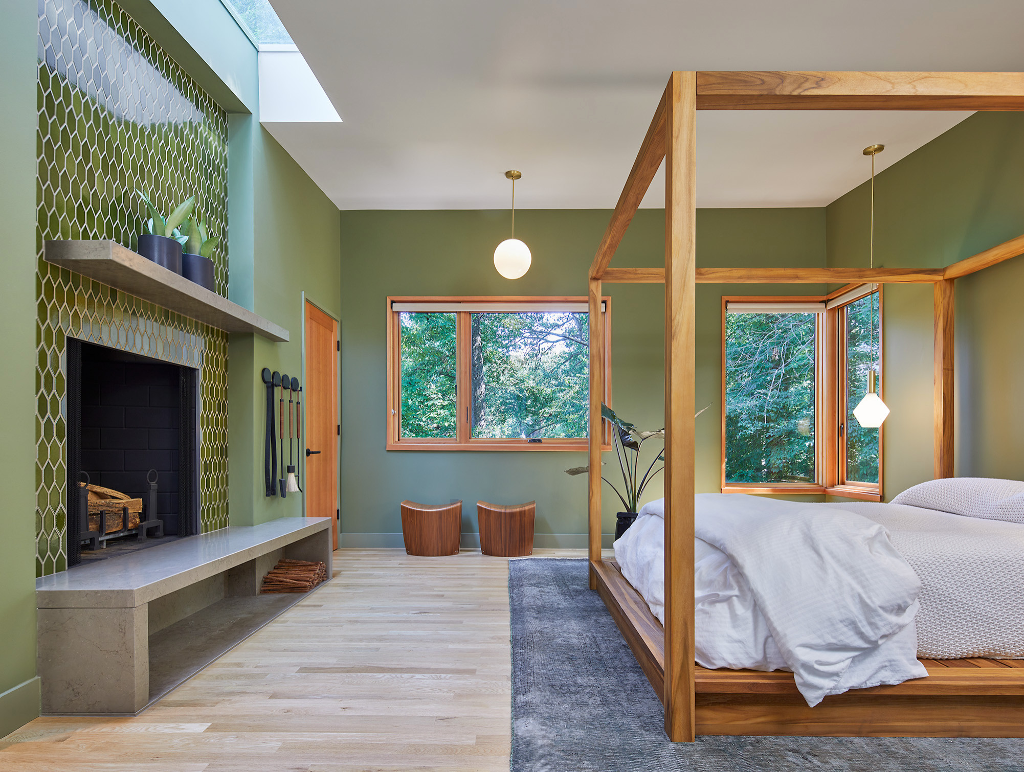 Other special features. Green walls (Avocado by Sherwin-Williams). Stained wood windows, doors and trim. The hearth is honed Lagos Azul limestone.