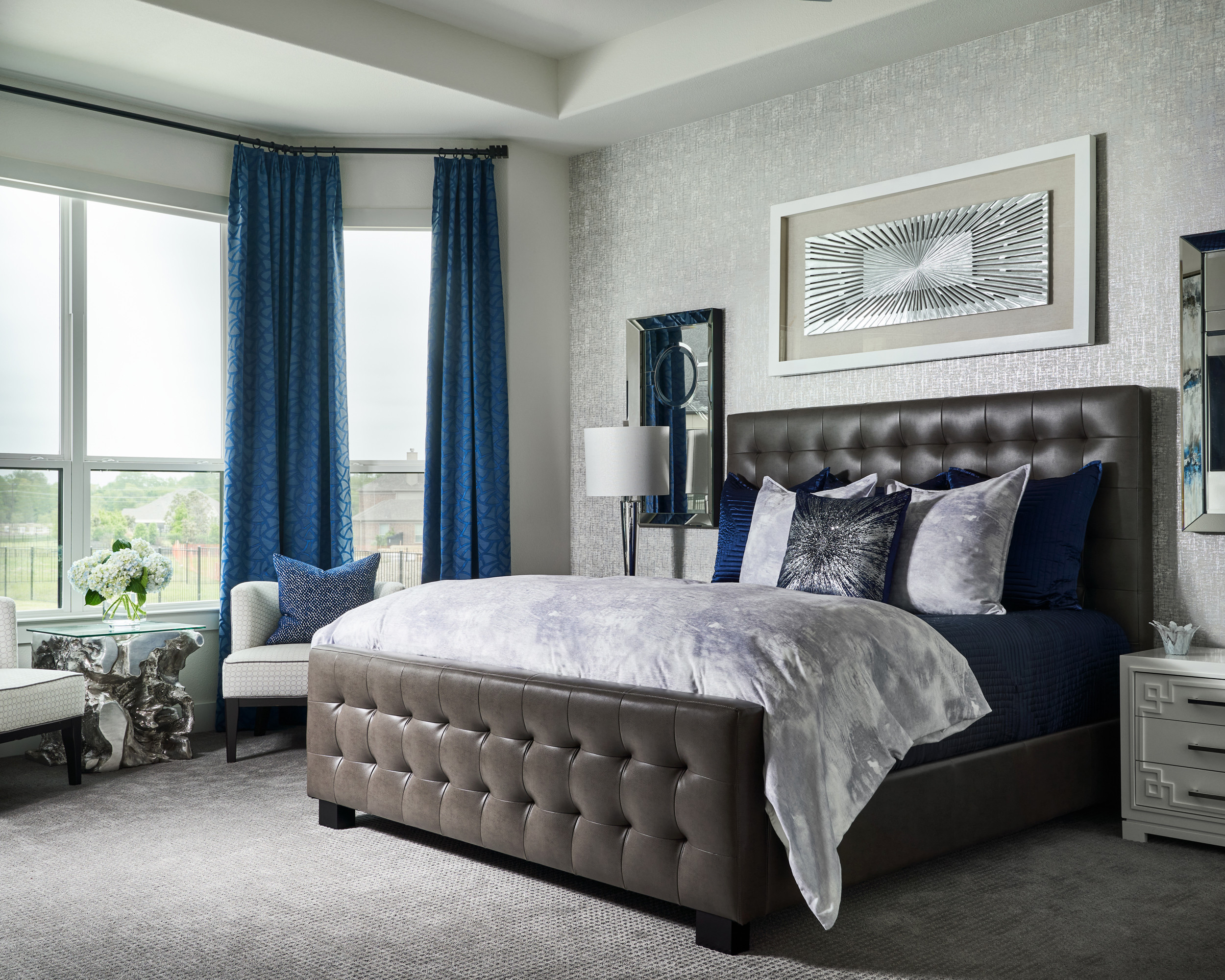 Other special features. Tufted leather bed frame and headboard. Royal blue drapes with a subtle pattern.