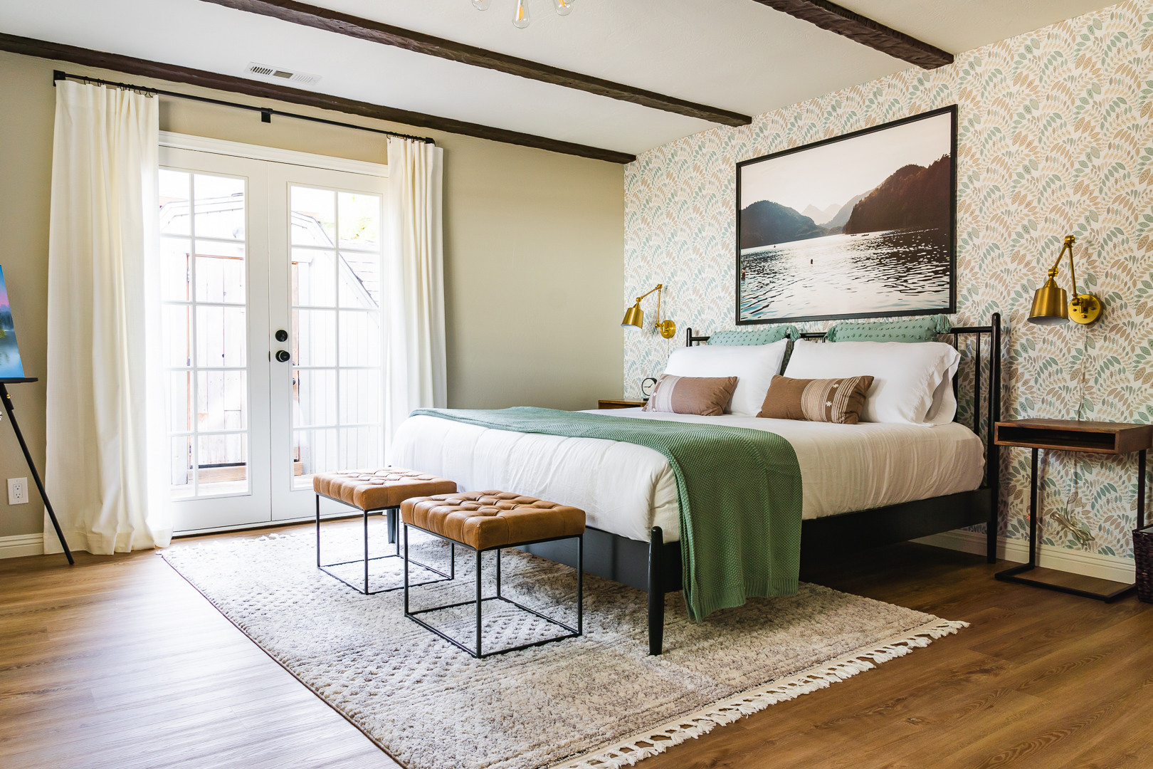 Main feature. “Every detail, from the light fixture to the wall color, was so carefully considered to create a classy, fun and whimsical room for guests,” Machado says. “But of course that gorgeous Winston Porter leaf wallpaper brought in the most crucial element, and we built a lot of the bedding and room design around it.”